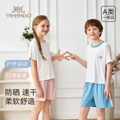 英氏儿童家居服套装男童女童空调服锦纶夏季薄款冰丝短袖短裤睡衣