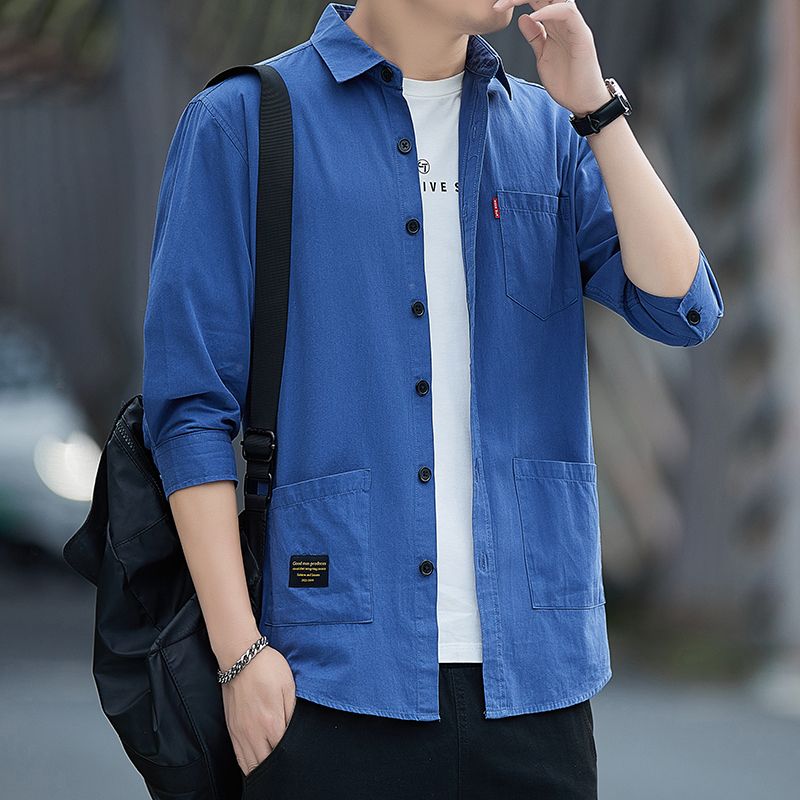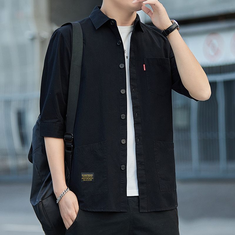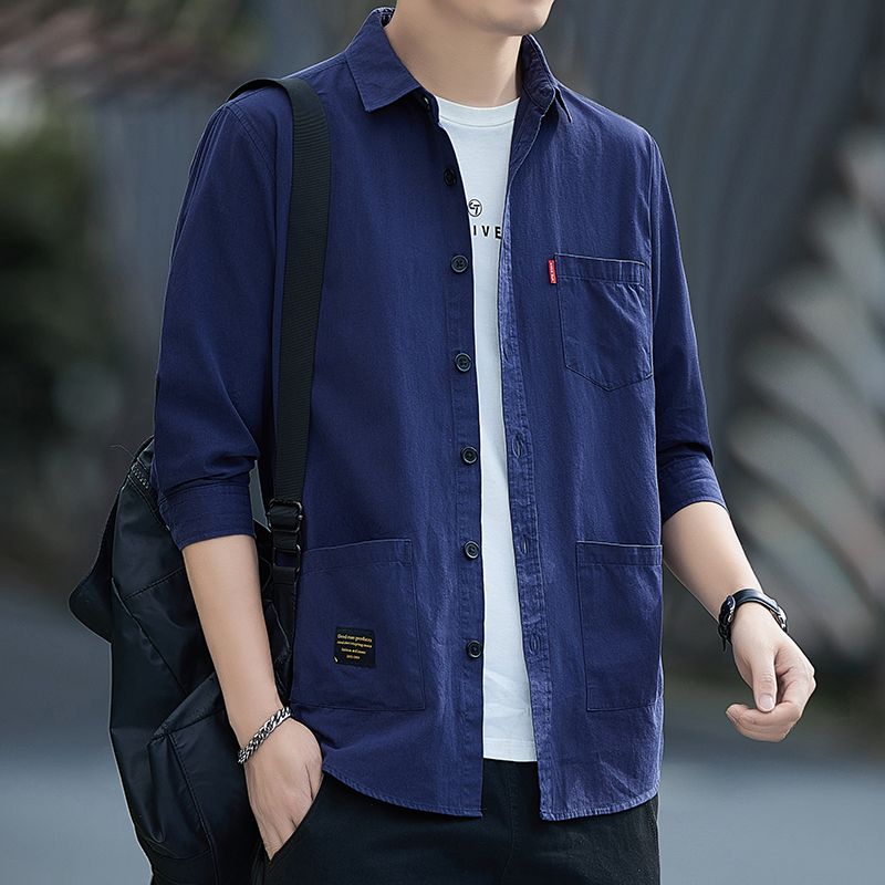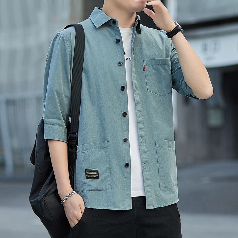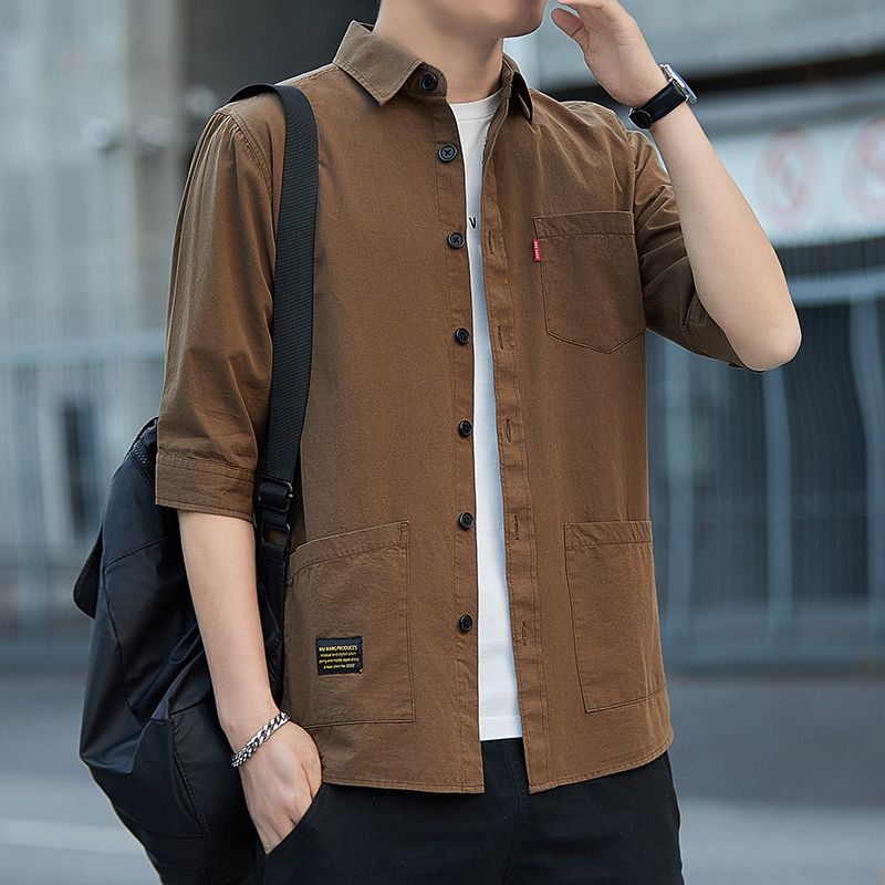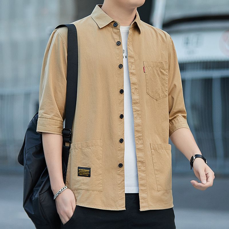 高档100%纯棉宽松版夏季七分袖衬衫男士休闲工装短袖衬衣中袖外