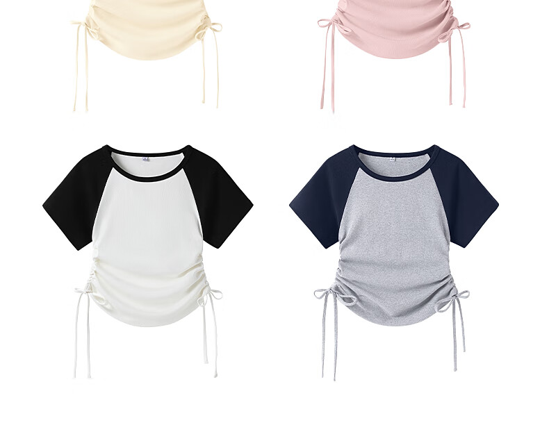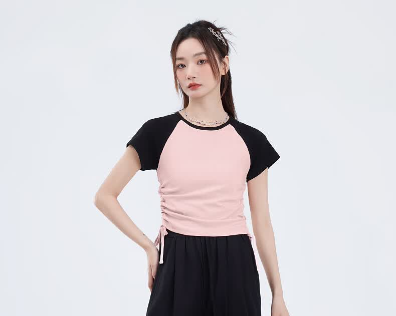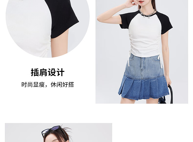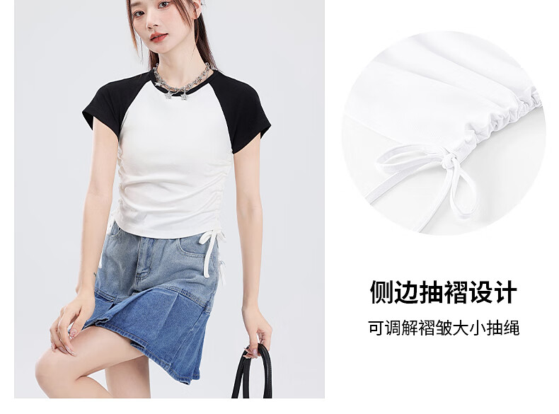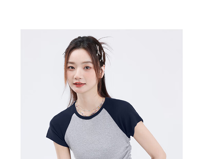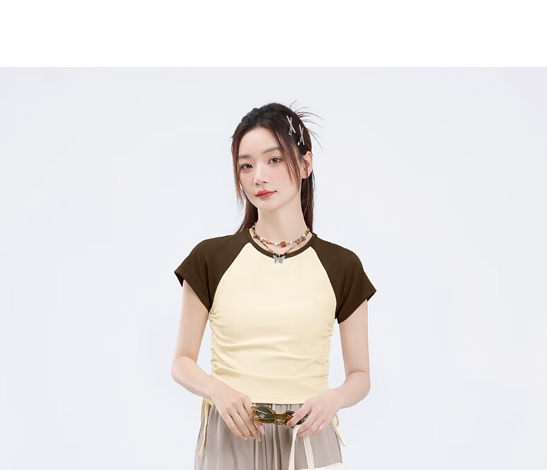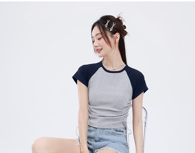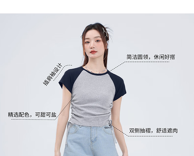 真维斯撞色抽褶紧身短款短袖t恤女夏季新款时尚休闲校园风半袖GX 麻灰-纯色 M