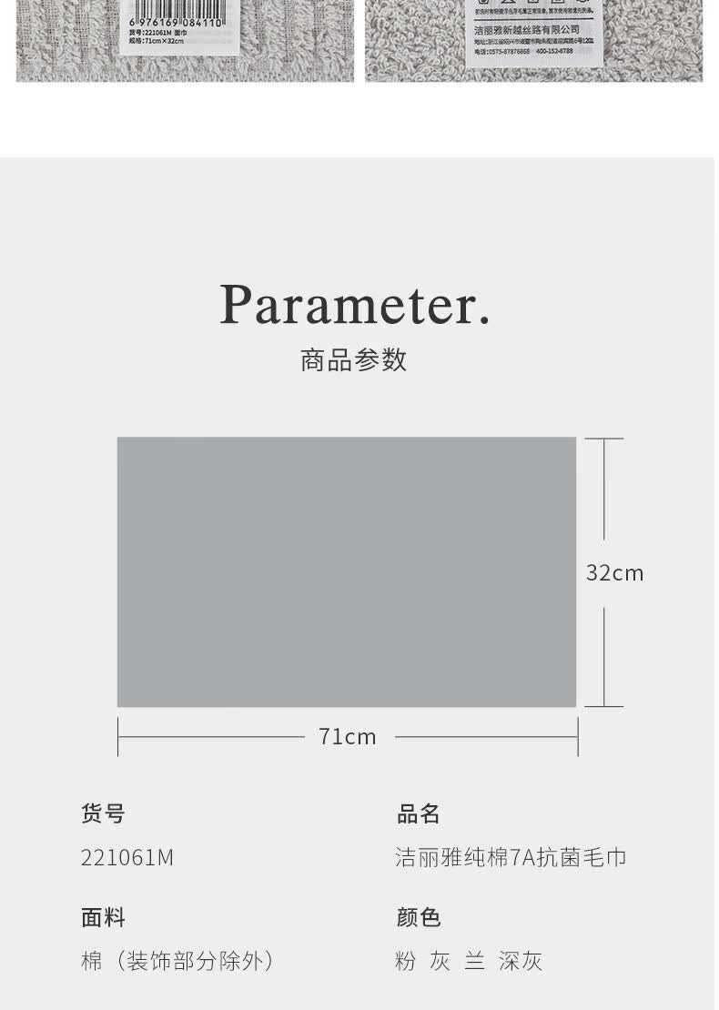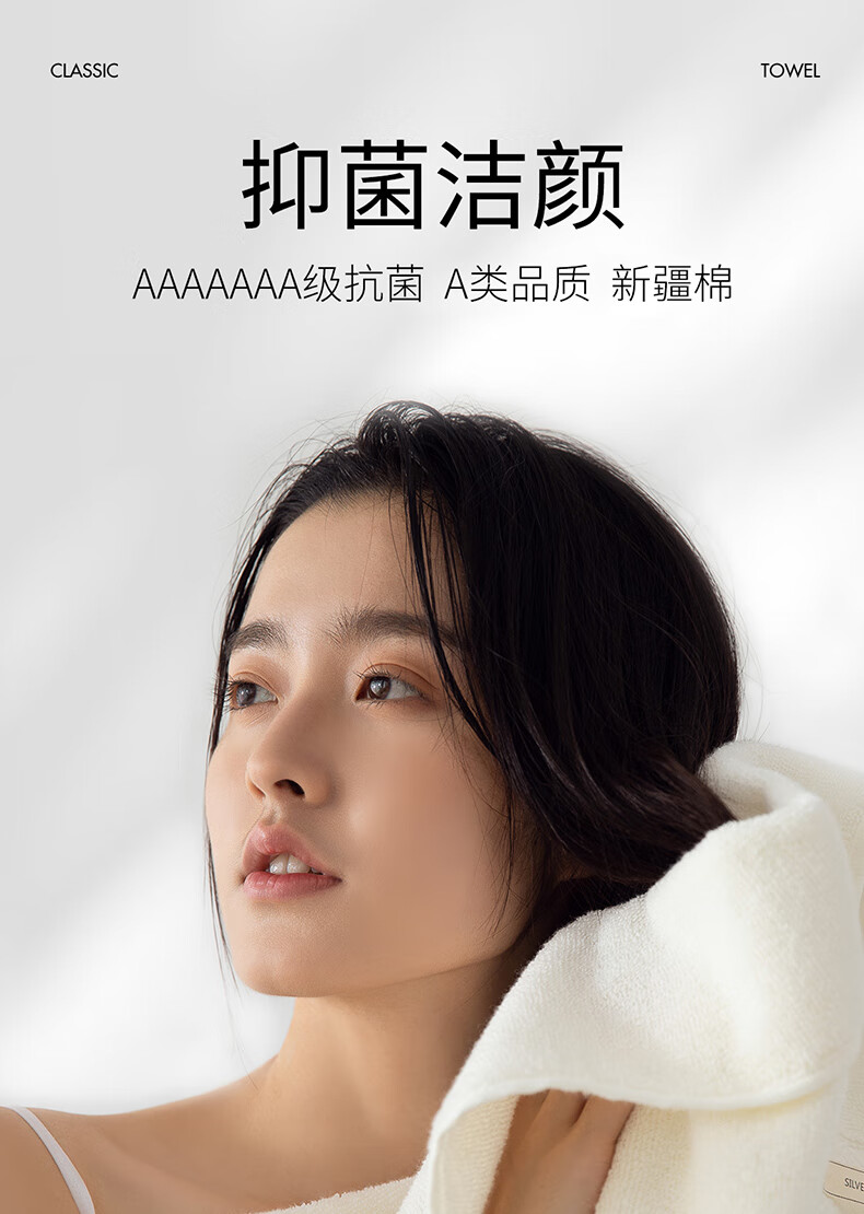 洁丽雅毛巾10A抗菌纯棉不掉毛2条120克加厚新疆棉 洗澡洗脸柔软吸水运动