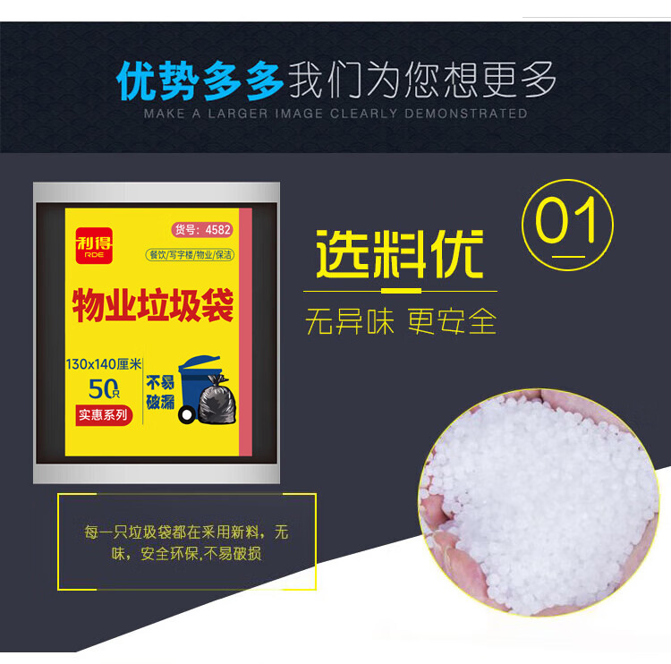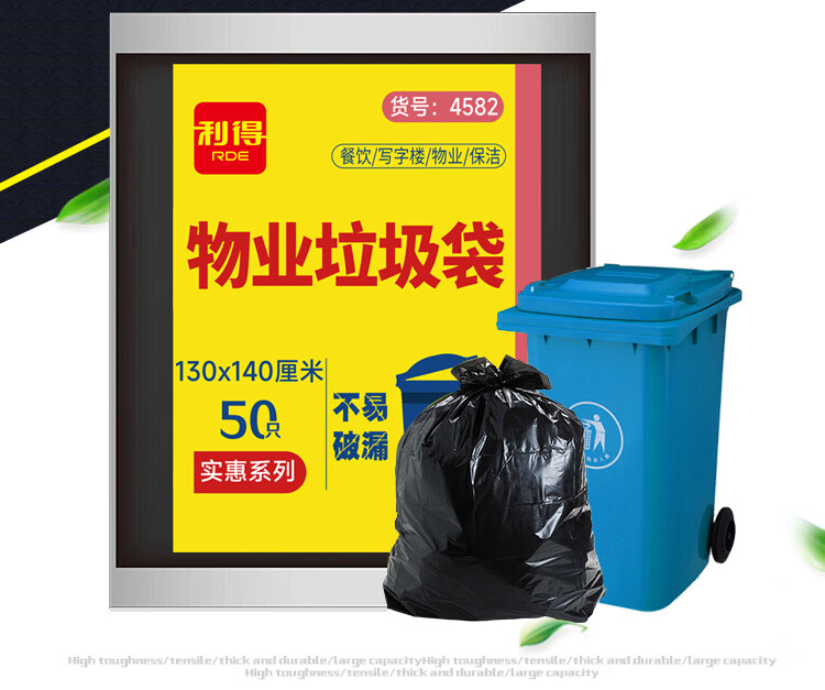 利得平口垃圾袋黑色130*140cm50只单面1.5丝大号加厚商用办公酒店厨房