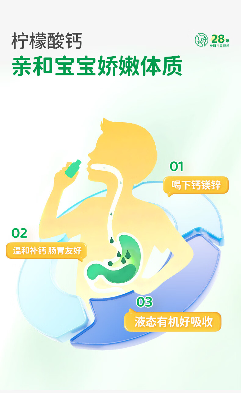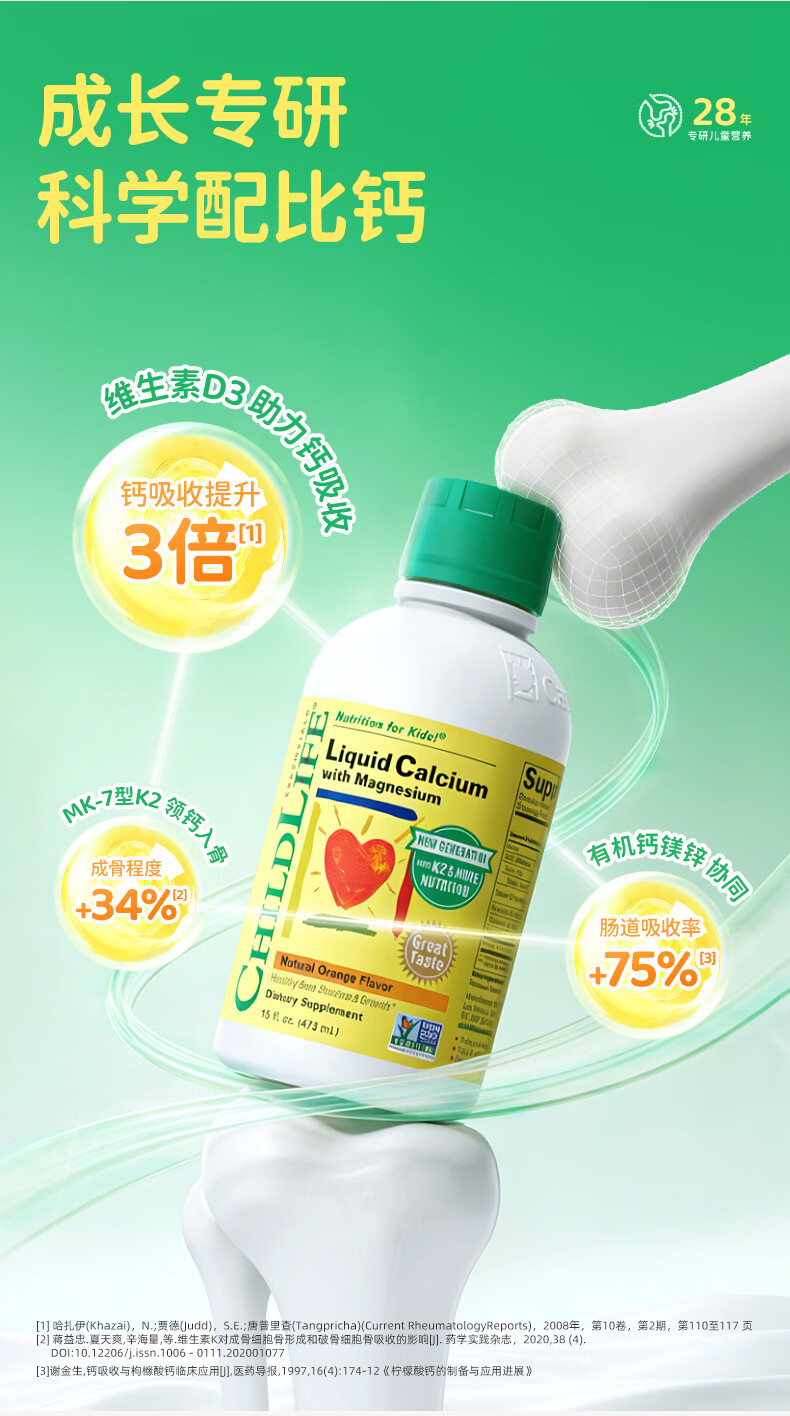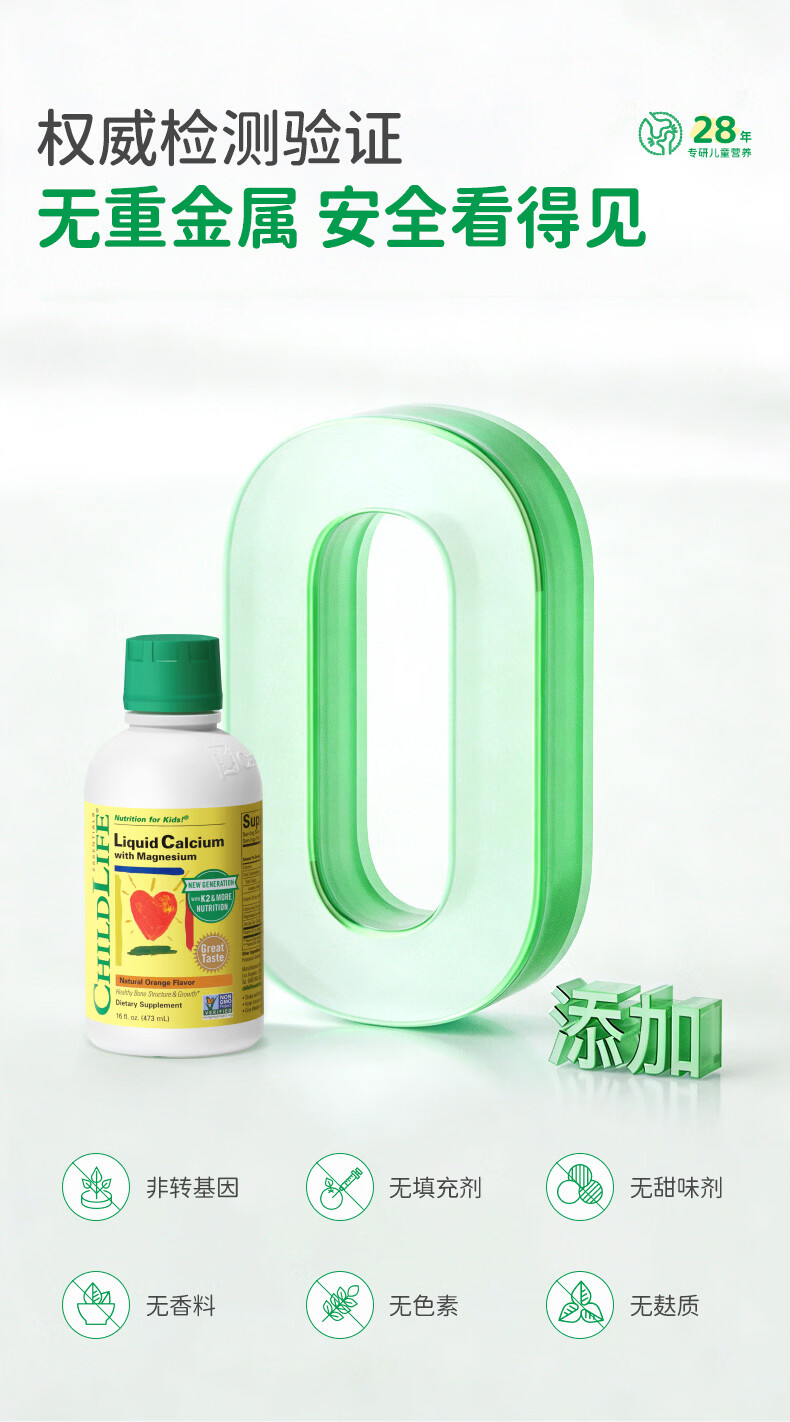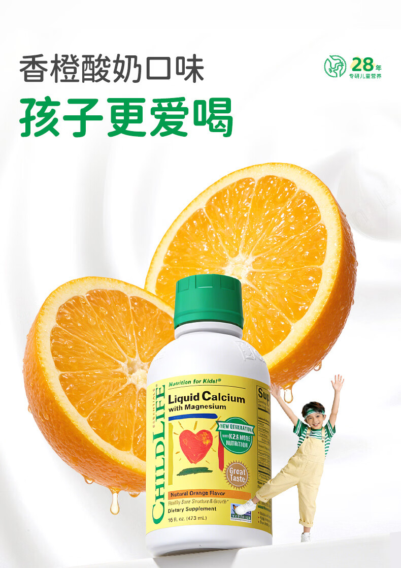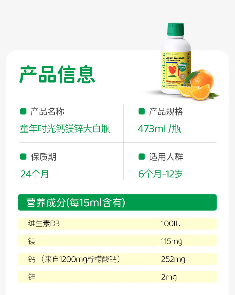童年时光 钙镁锌液体钙大白瓶婴幼儿童补钙含K2维生素d3 473ml (便捷装)液体钙镁锌 10ml*30包