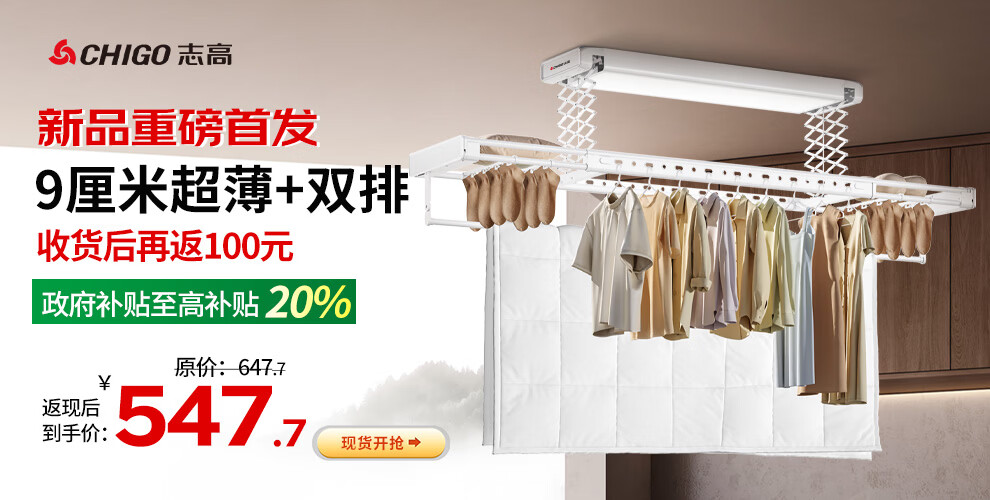 志高(CHIGO)超薄隐形电动晾衣架双排遥控升降阳台嵌入式智能家用自动晾衣杆机 白色|48瓦全屏照明+语音+双排