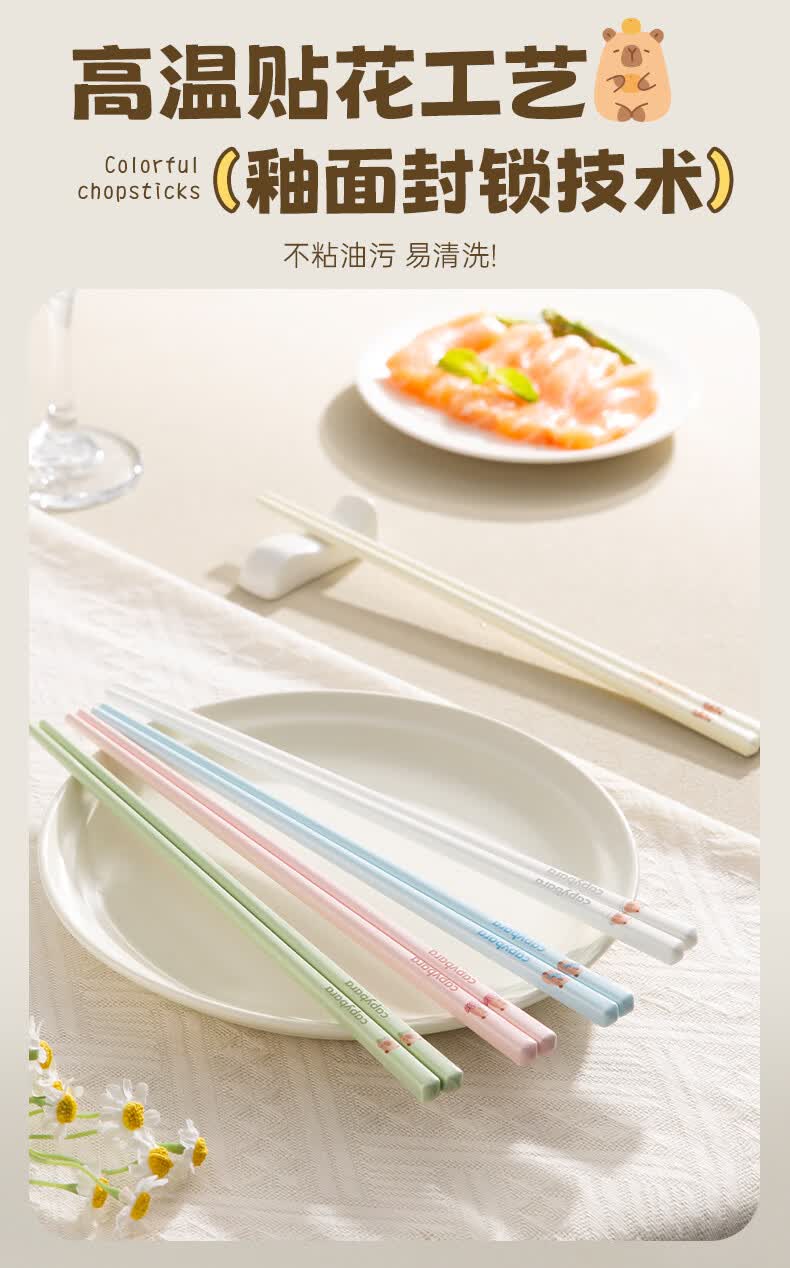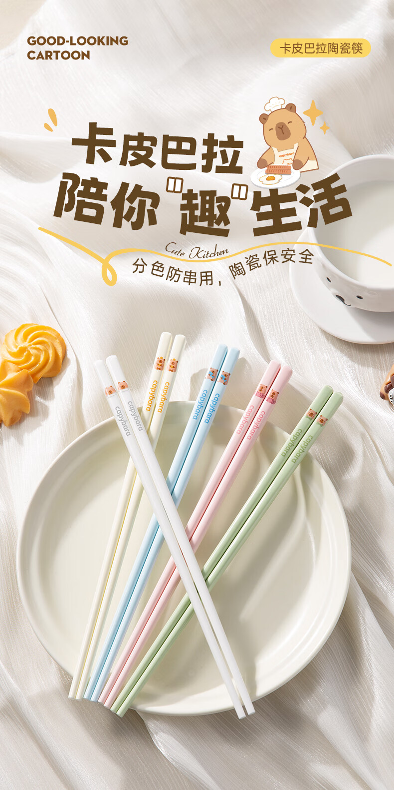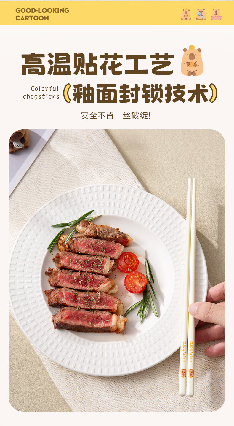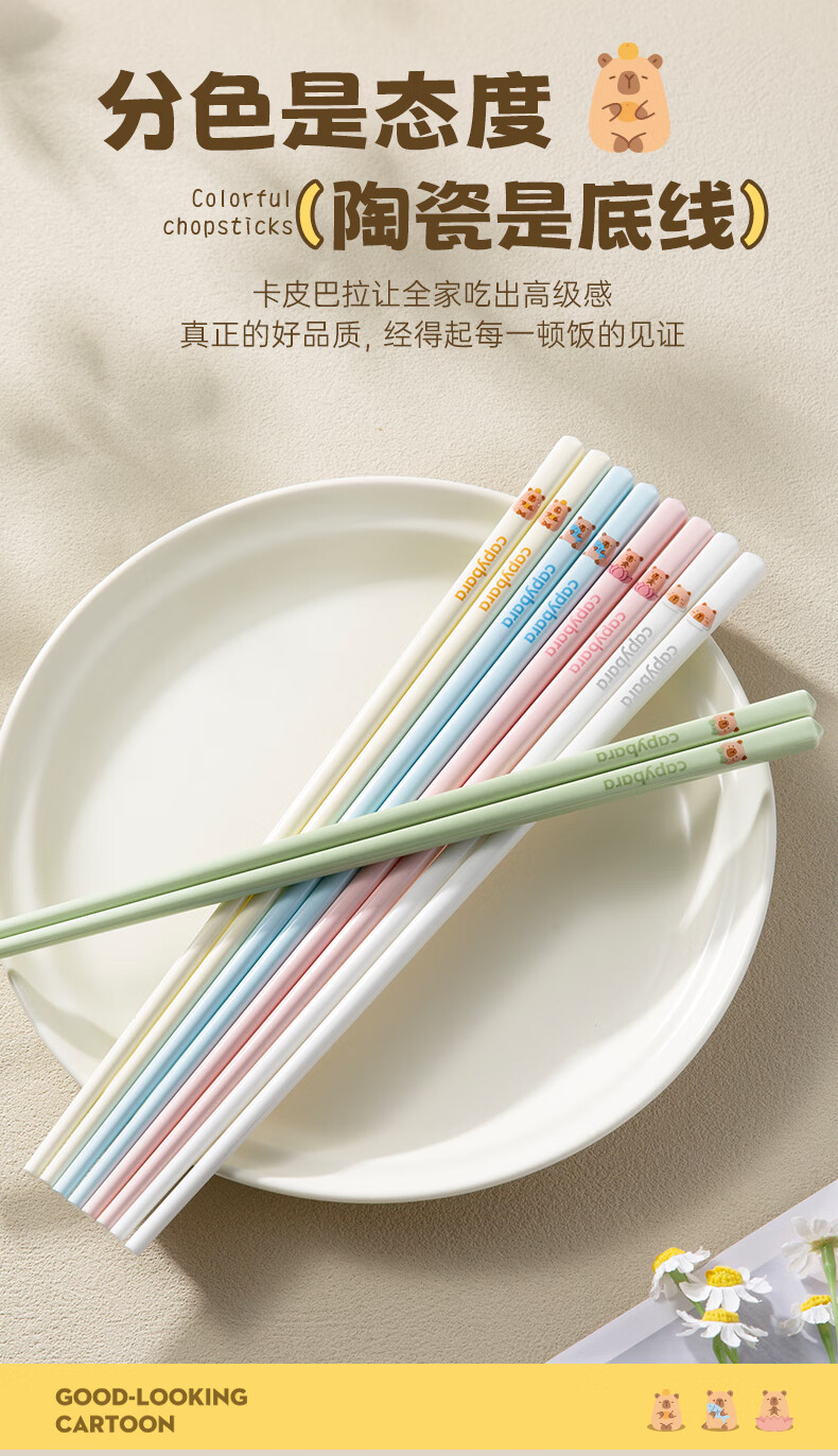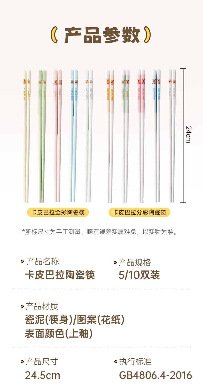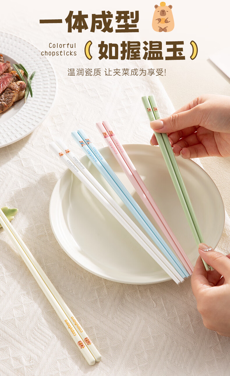双枪家用陶瓷筷子食品接触级抗菌防霉 卡皮巴拉10双装 高档礼盒装
