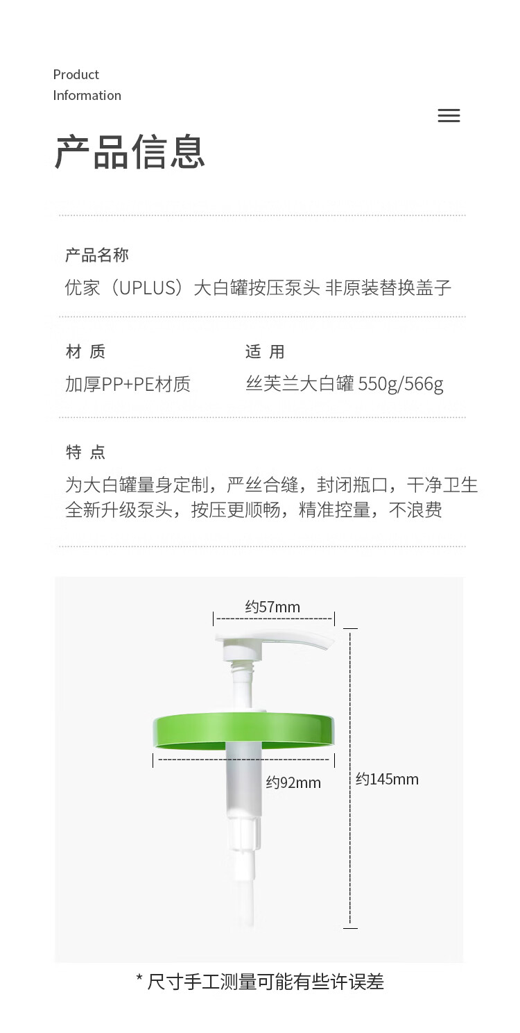 优家(UPLUS)大白罐按压泵头 适用丝塔芙身体乳挤压泵头盖非原装替换盖子