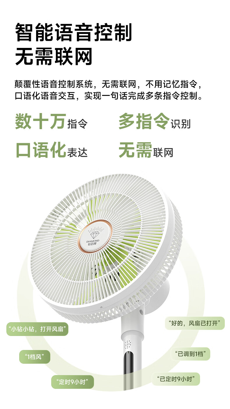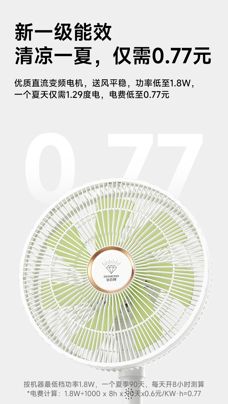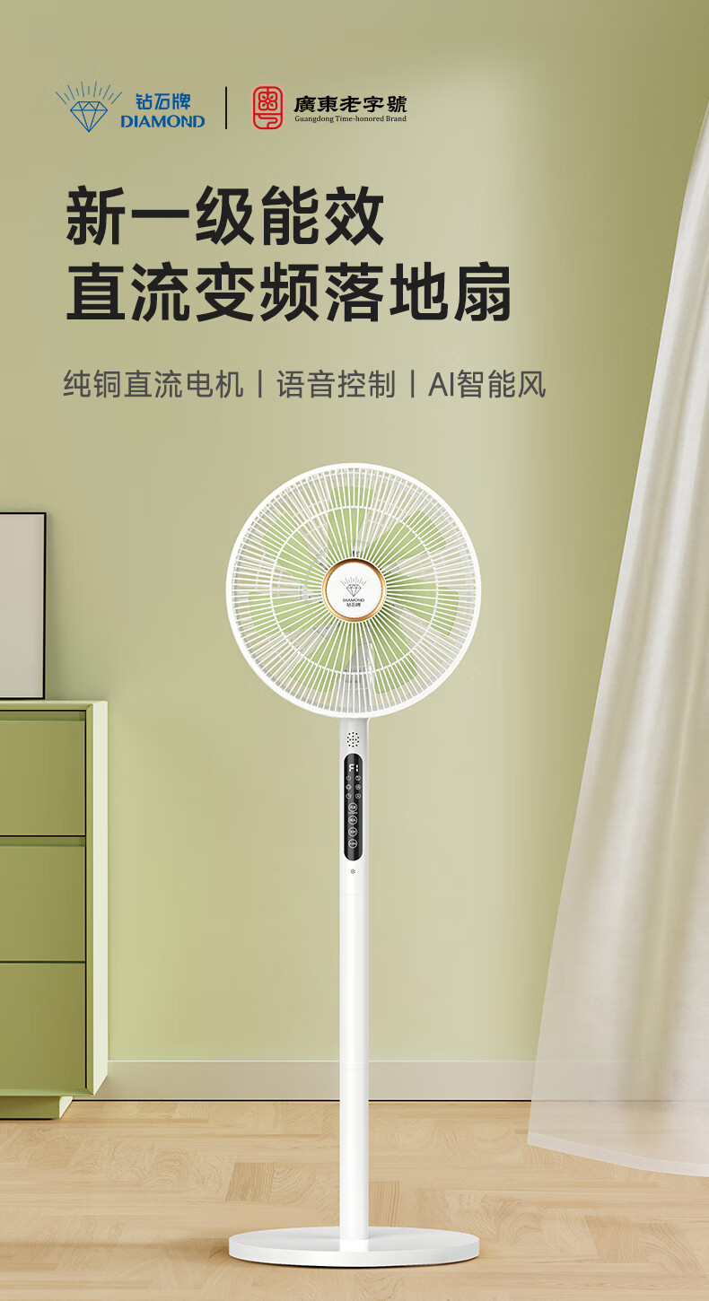 钻石牌落地扇家用电风扇【1级能效+直流变频+纯铜电机】摇头扇强劲风力省电电扇AI语音遥控DFS-ZBHR07