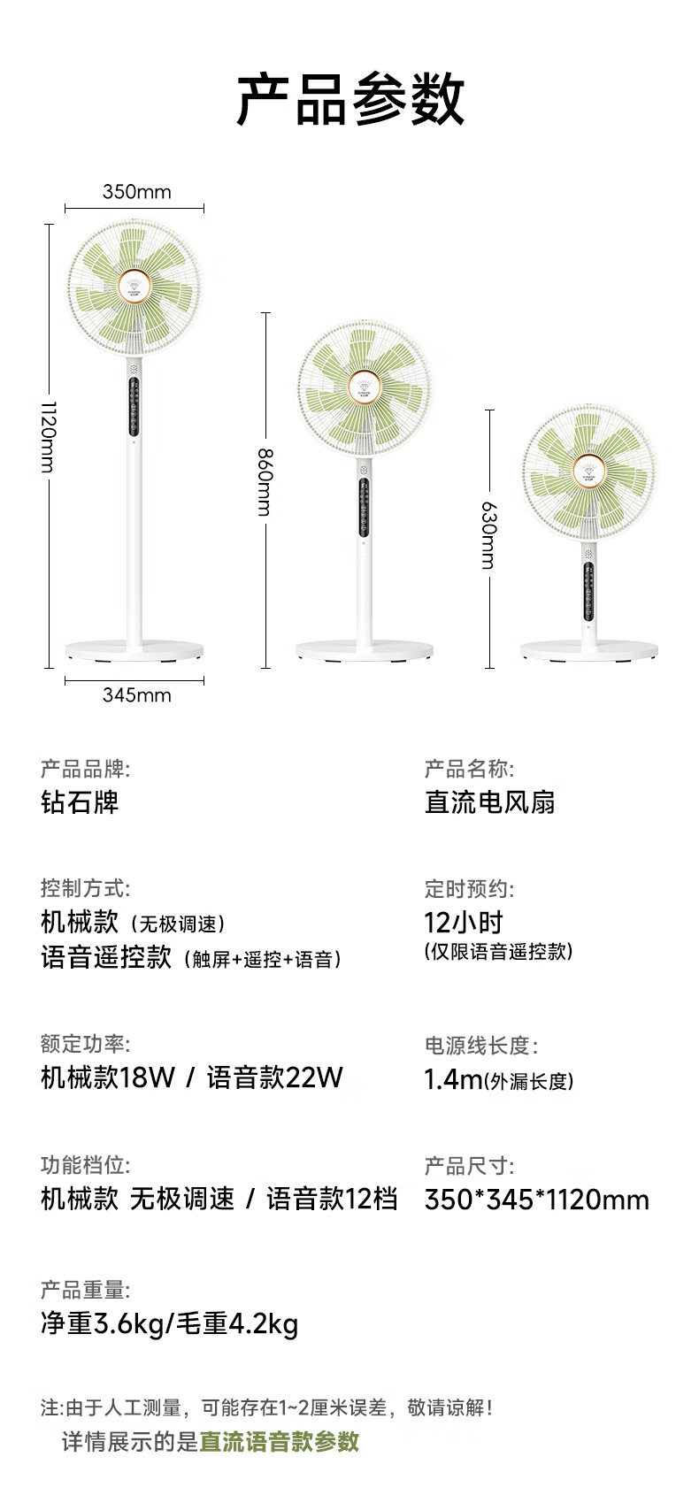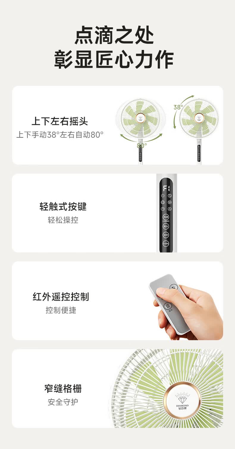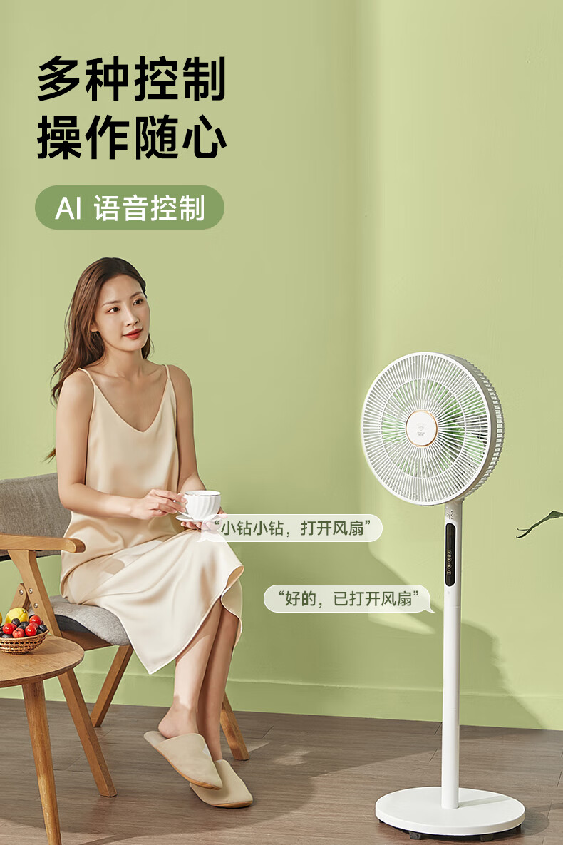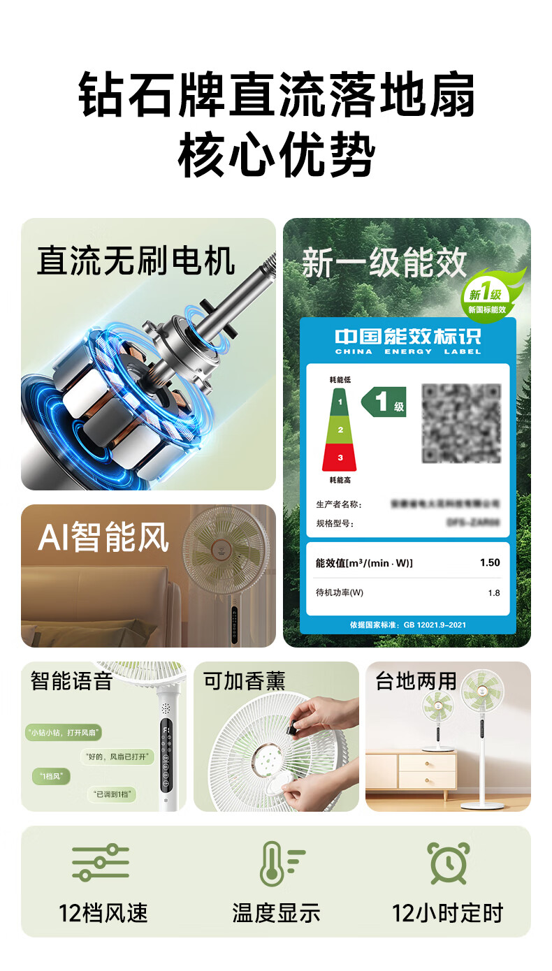 钻石牌落地扇家用电风扇【1级能效+直流变频+纯铜电机】摇头扇强劲风力省电电扇AI语音遥控DFS-ZBHR07