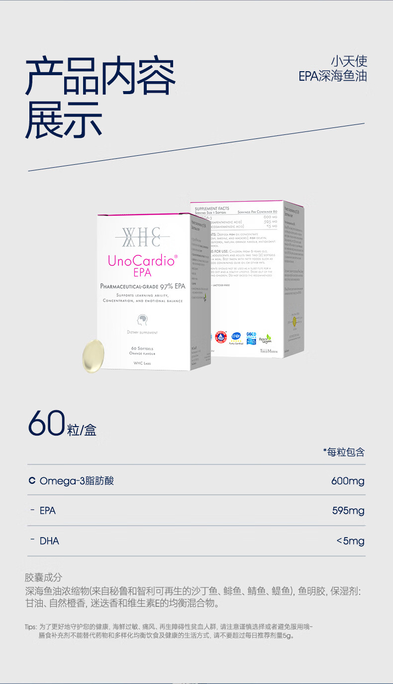 WHC小天使97%EPA高纯度鱼油omega3鱼油中老年软胶囊辅助降血脂60粒