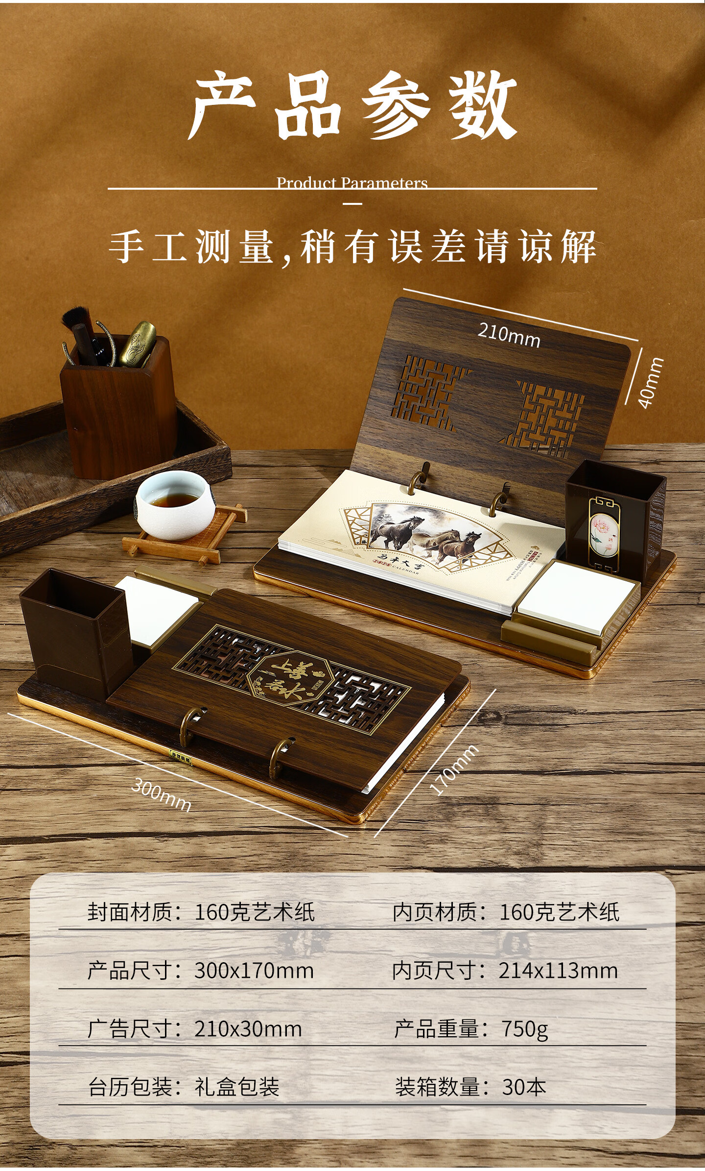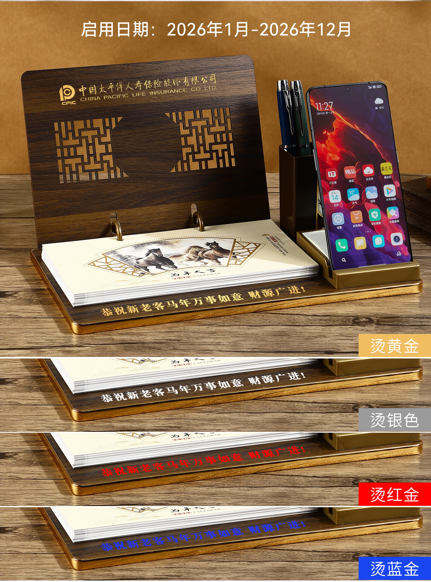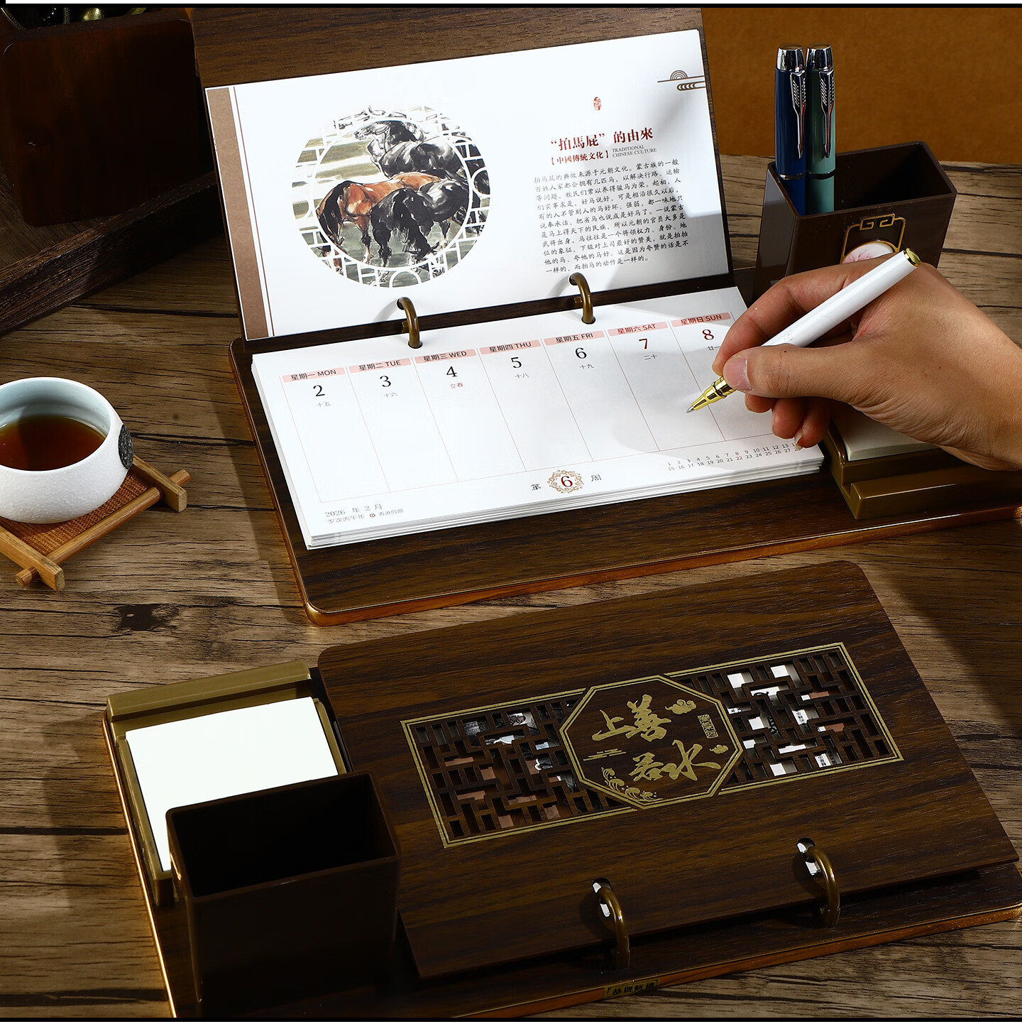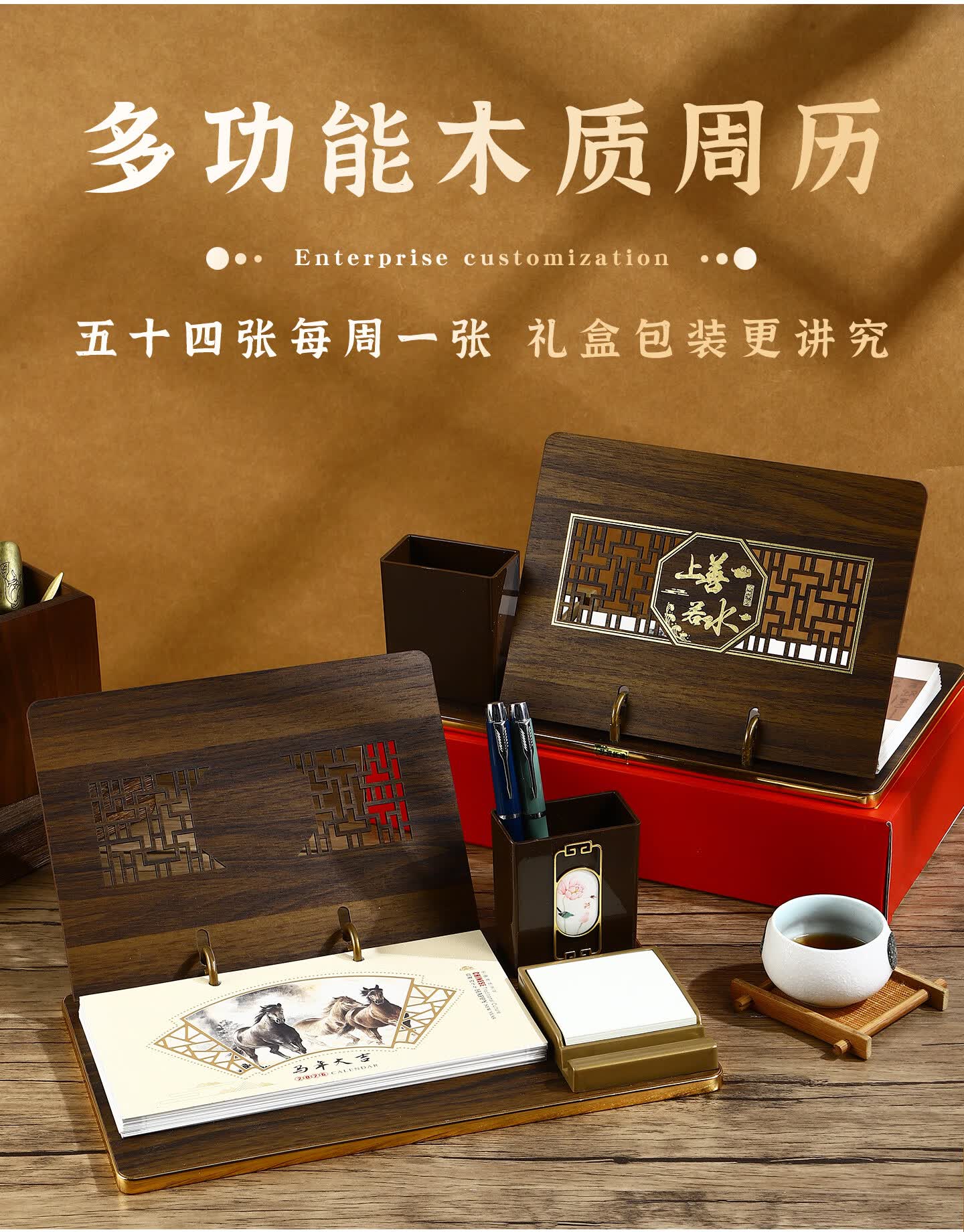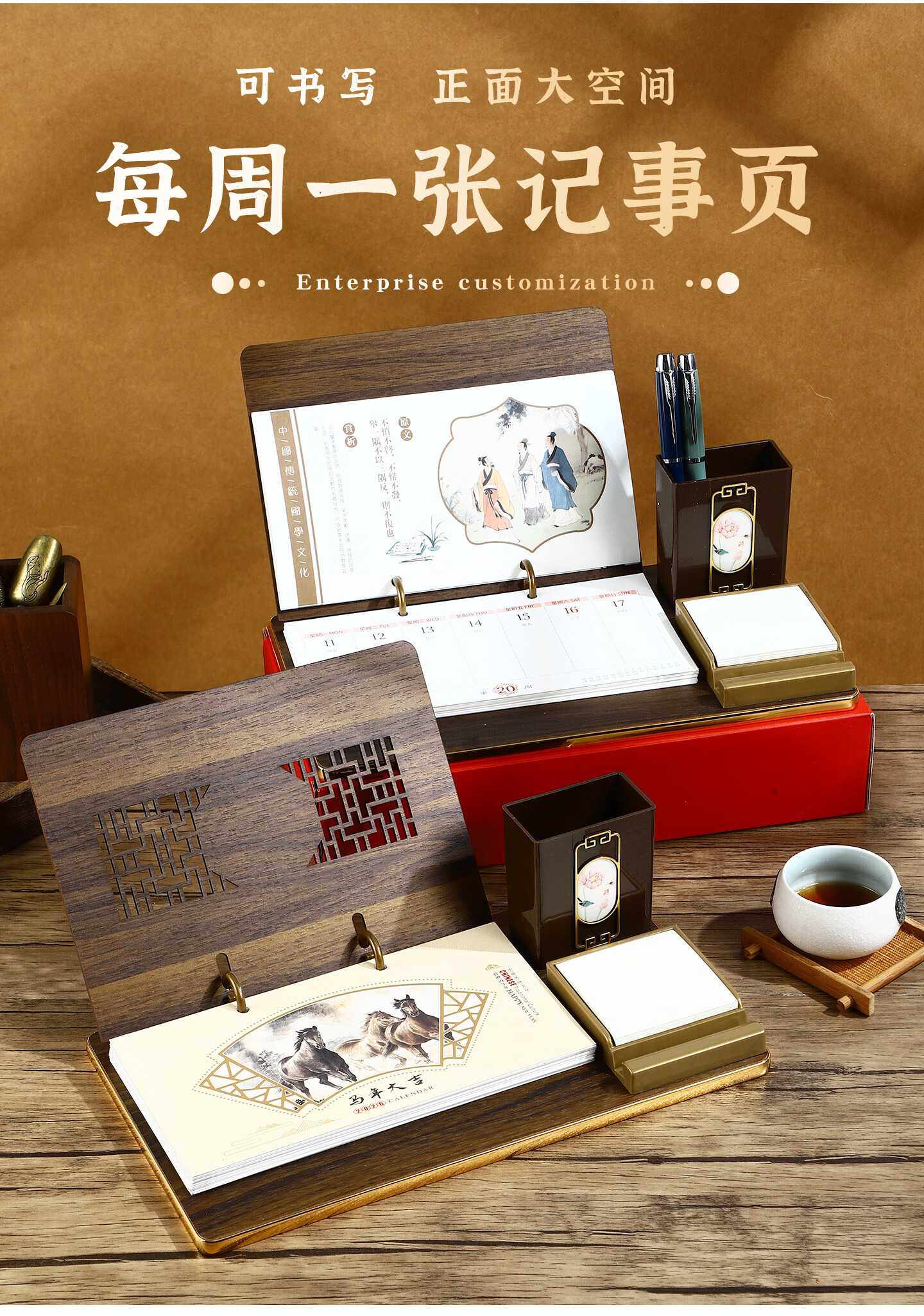 锦兔2026木质台历架多功能带笔筒台座周历定制日历桌面摆件月历创意订制商务精美高端记事周历 马年大吉