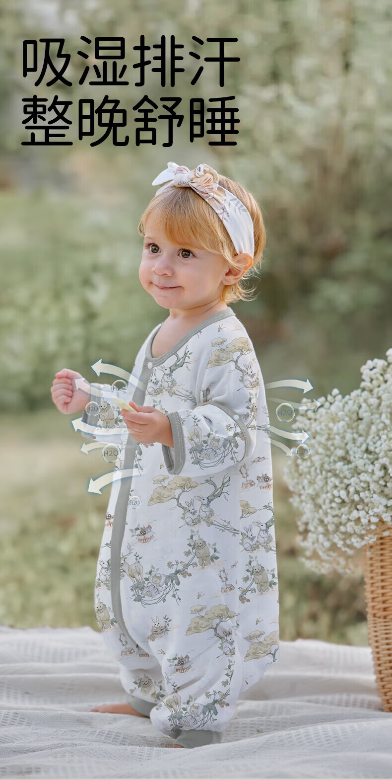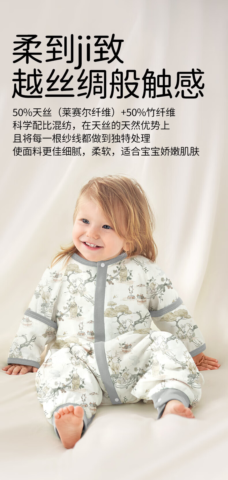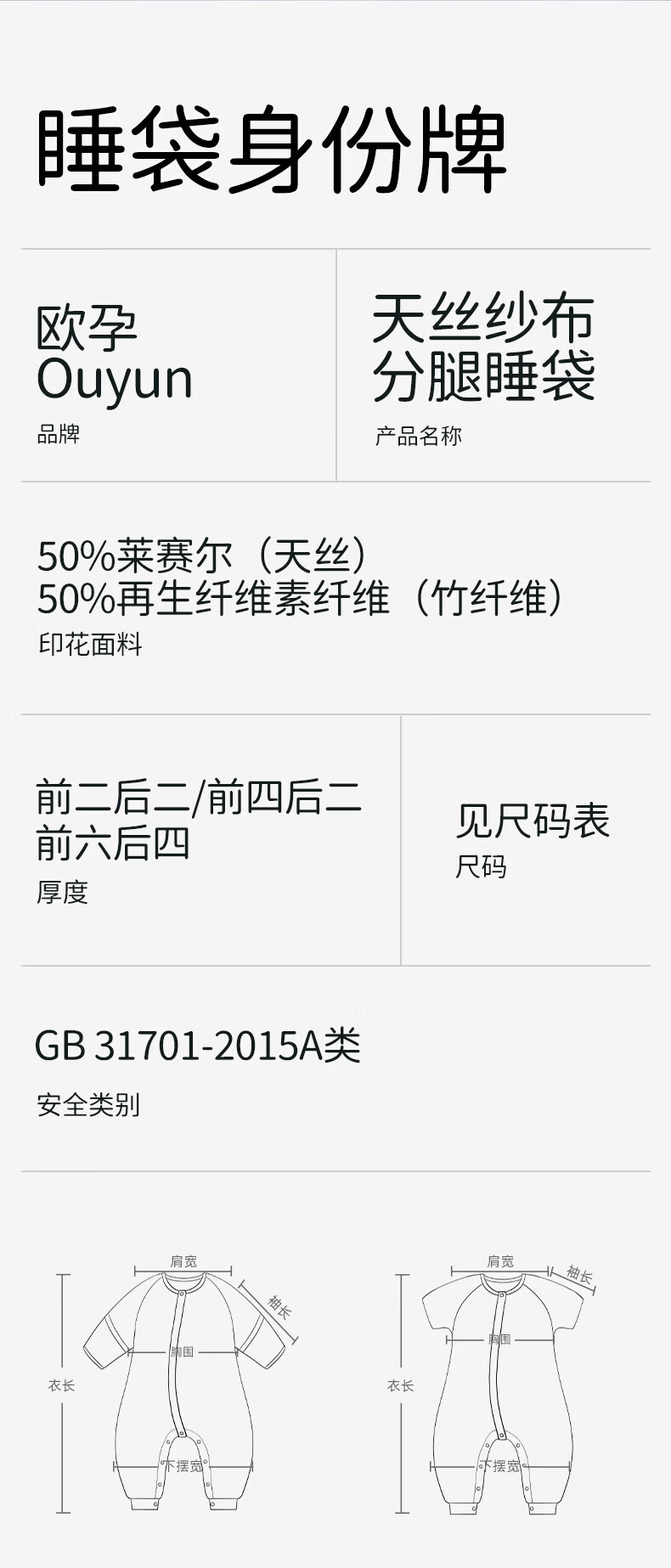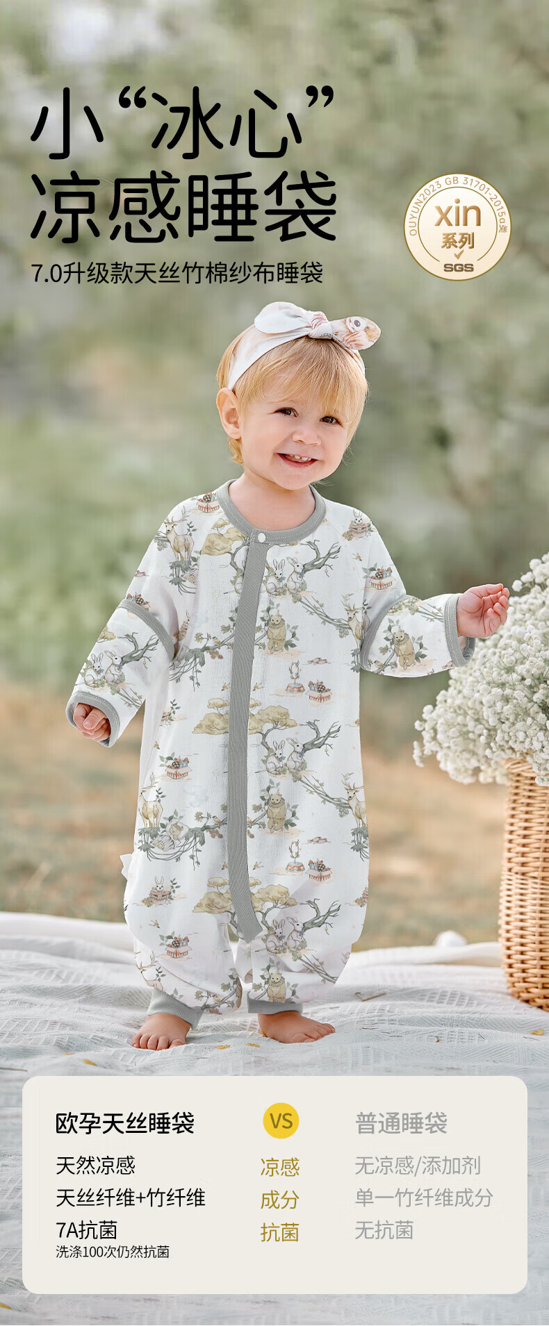欧孕(OUYUN)【小冰心】婴儿睡袋春秋款竹纤维天丝纱布宝宝防踢被儿童分腿睡袋 菇菇兔-前六后四可拆袖 90/52【推荐身高80-95CM】