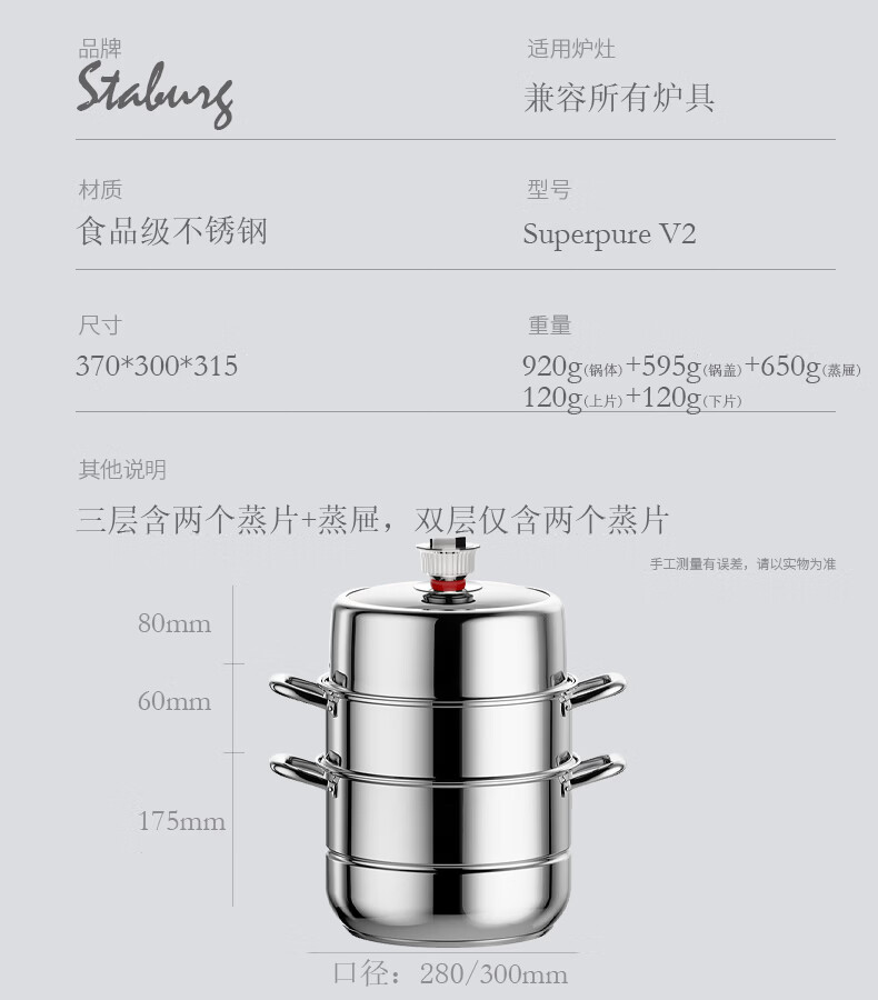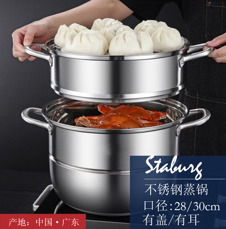 STABURG智能防干烧定时不锈钢蒸锅三层加厚家用蒸笼蒸屉电磁炉燃气通用 智能定时/预防干烧/食品级不锈钢 3层 28cm