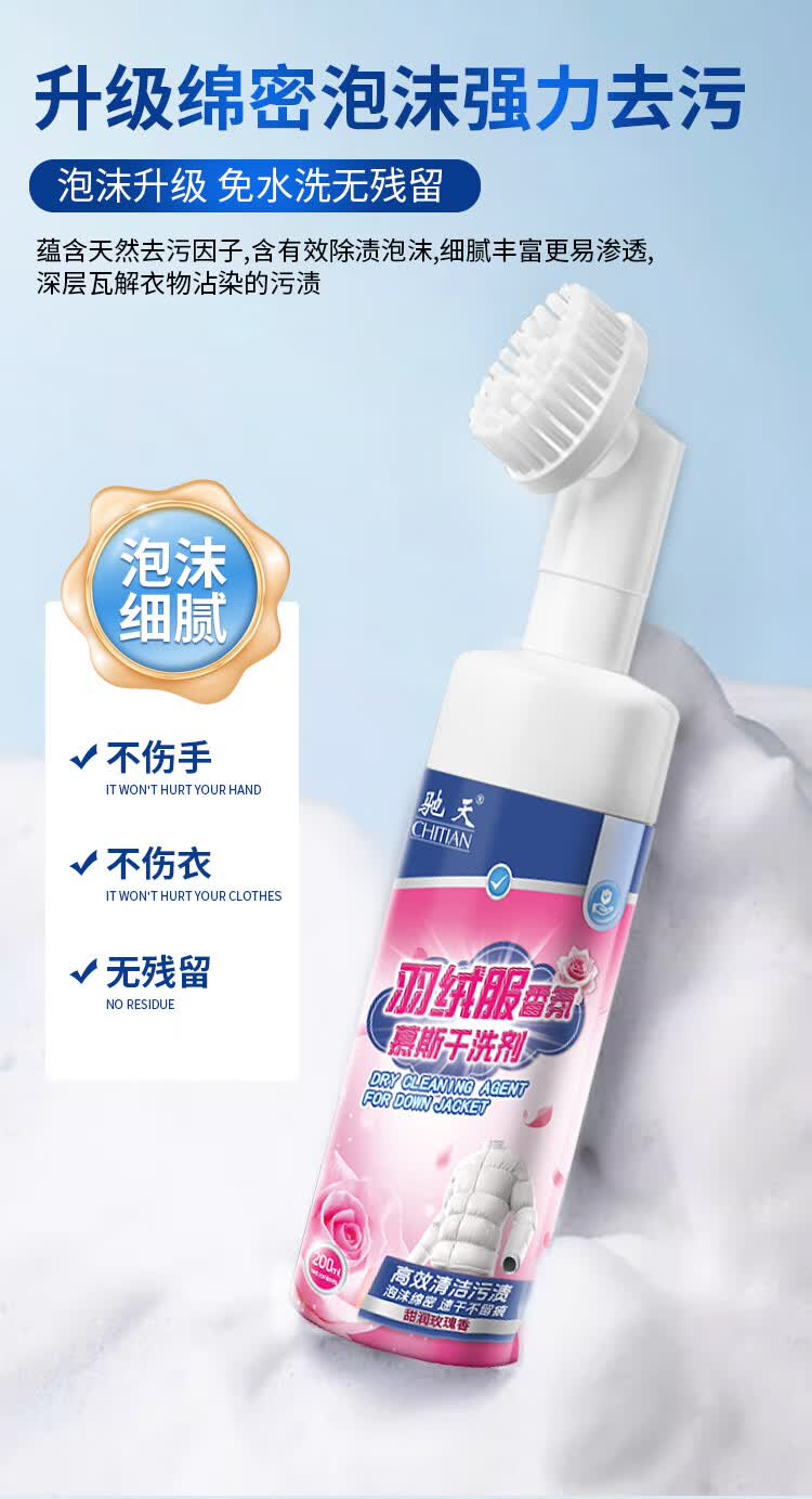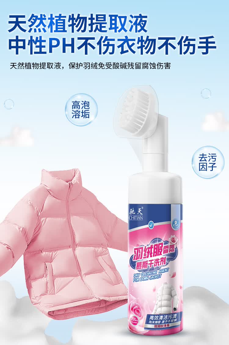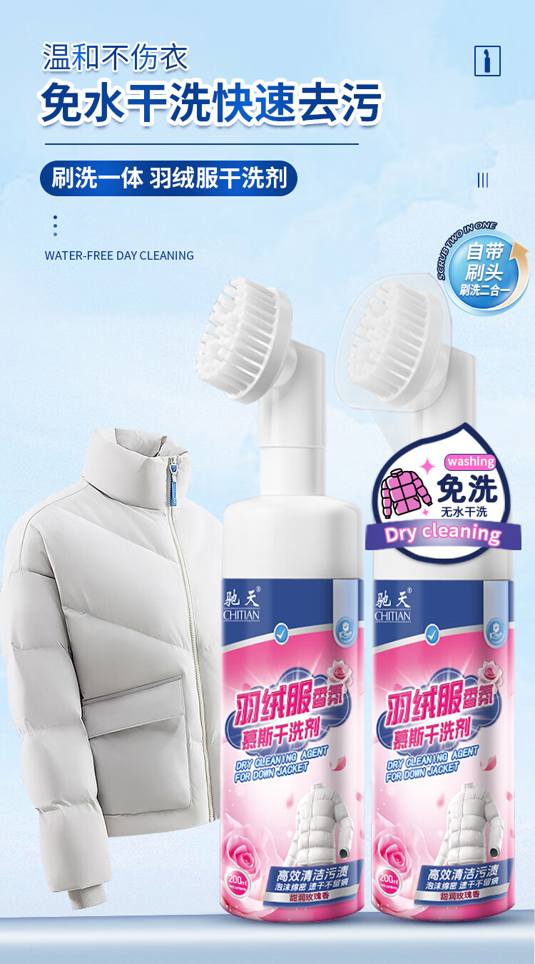 驰天(CHITIAN)【强效去污不留痕】羽绒服干洗剂免水洗羽绒服蓬松去渍专用清洗剂 加强款*2瓶+1个高泡刷头