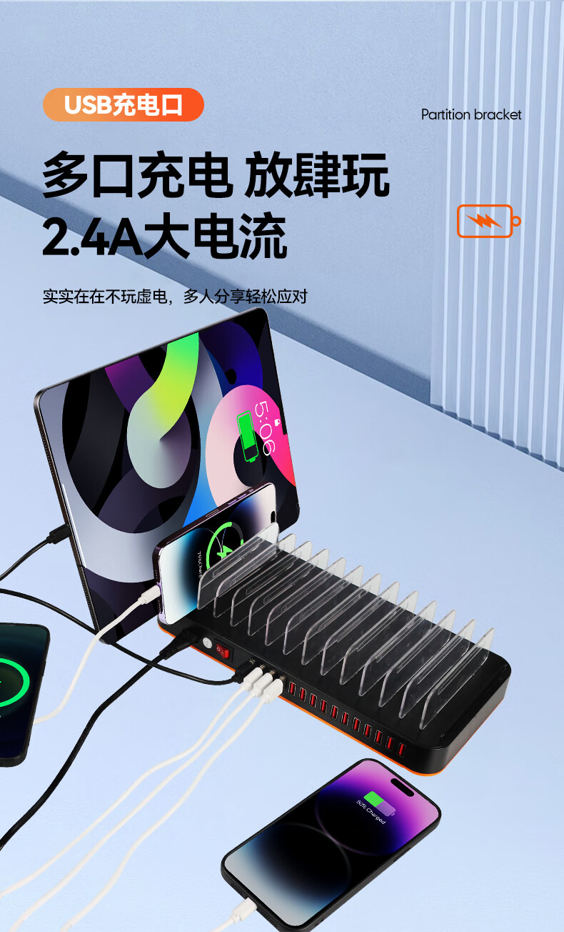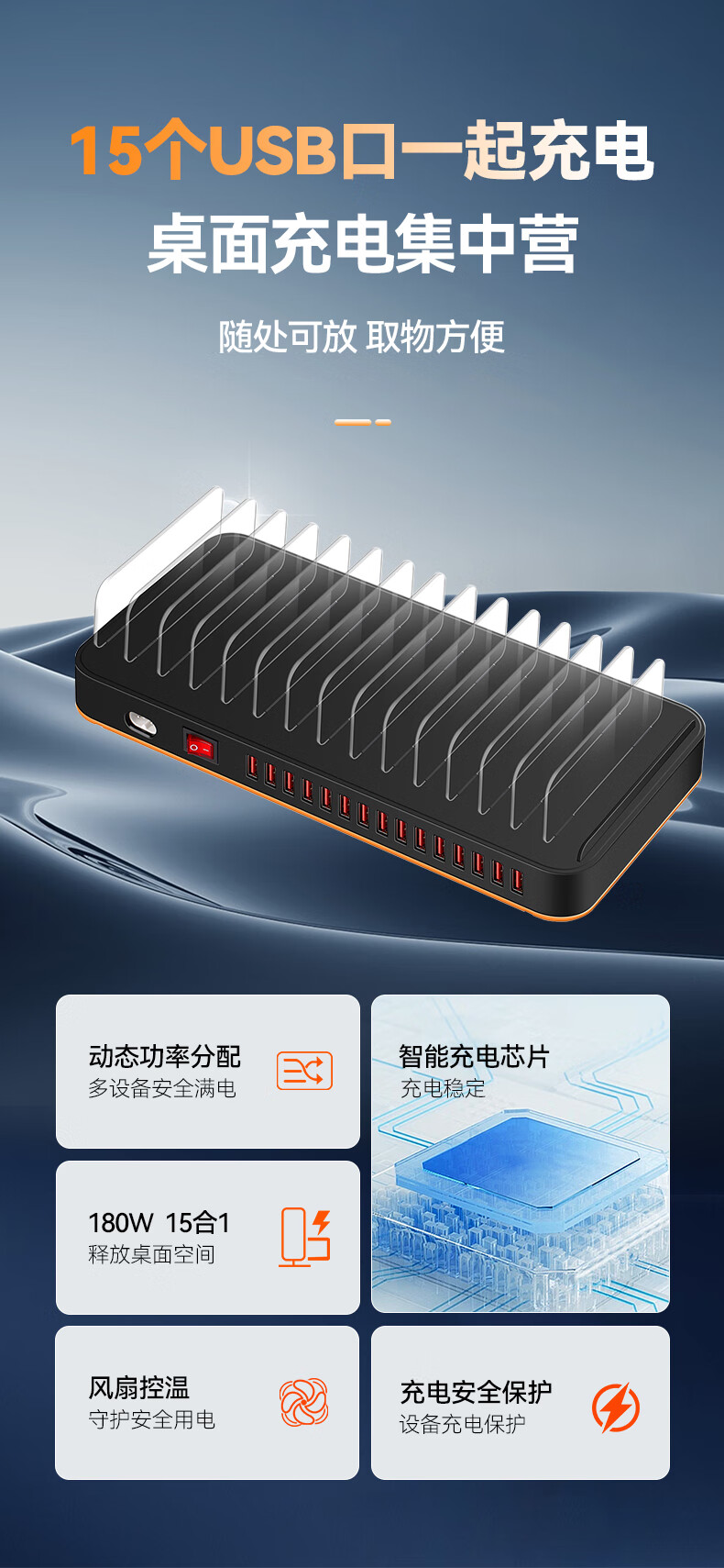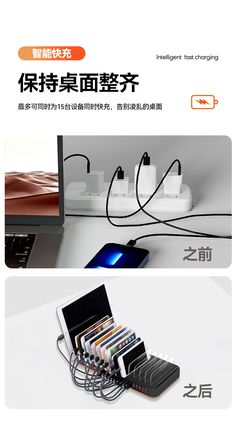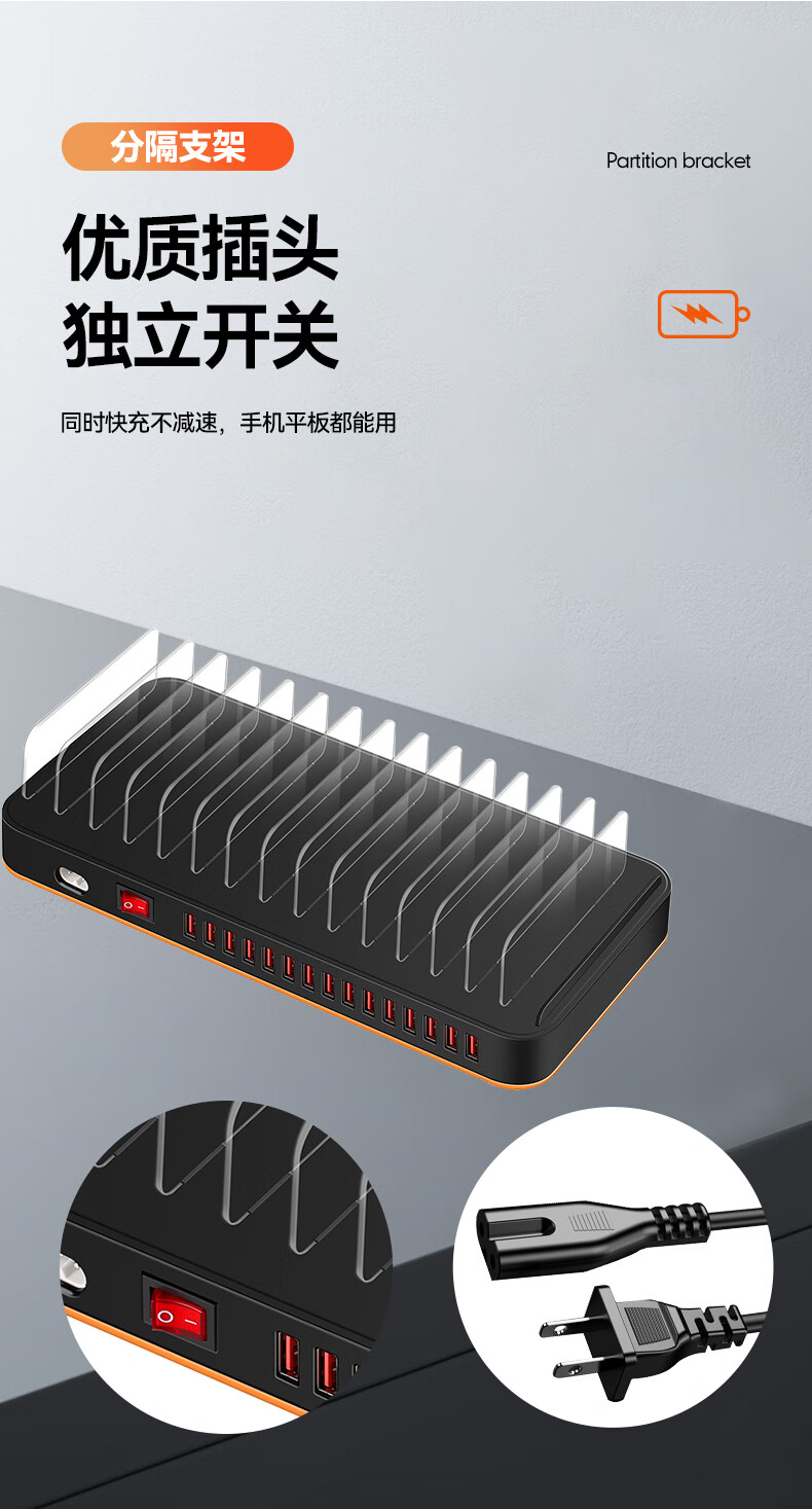 万隆欣多口usb充电器桌面充电站插头快充多台手机充电桩工作室多孔集成支架插座插排多功能大功率充电坞 15口180W托盘立式充电器+15根安卓短线