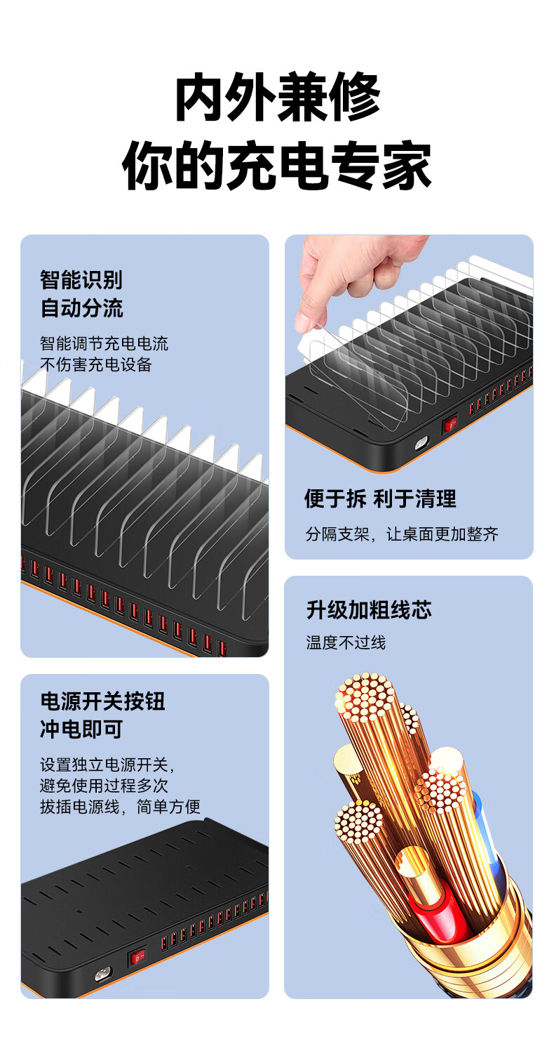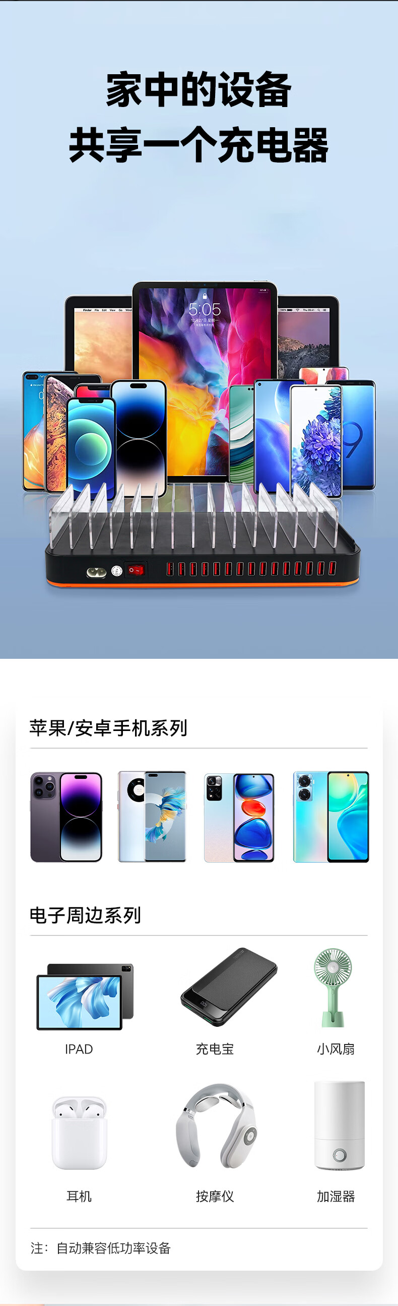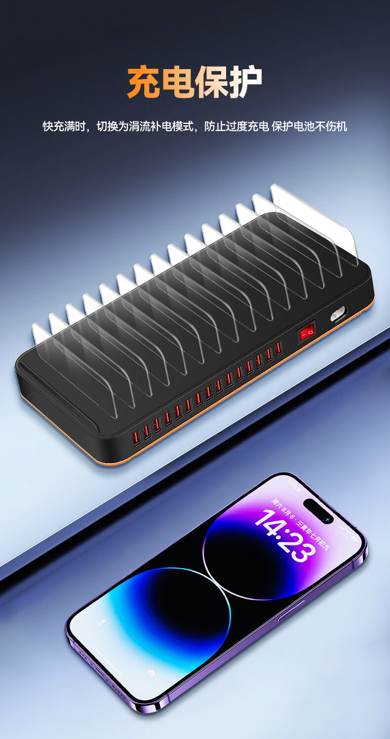 万隆欣多口usb充电器桌面充电站插头快充多台手机充电桩工作室多孔集成支架插座插排多功能大功率充电坞 15口180W托盘立式充电器+15根安卓短线