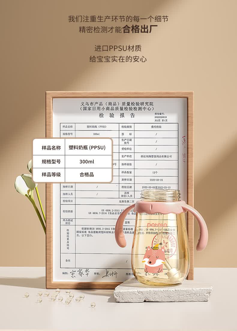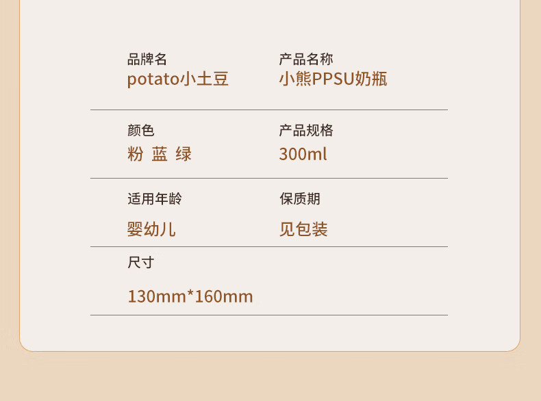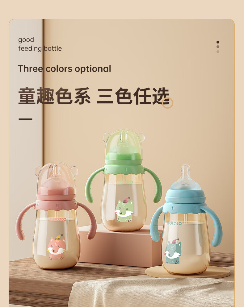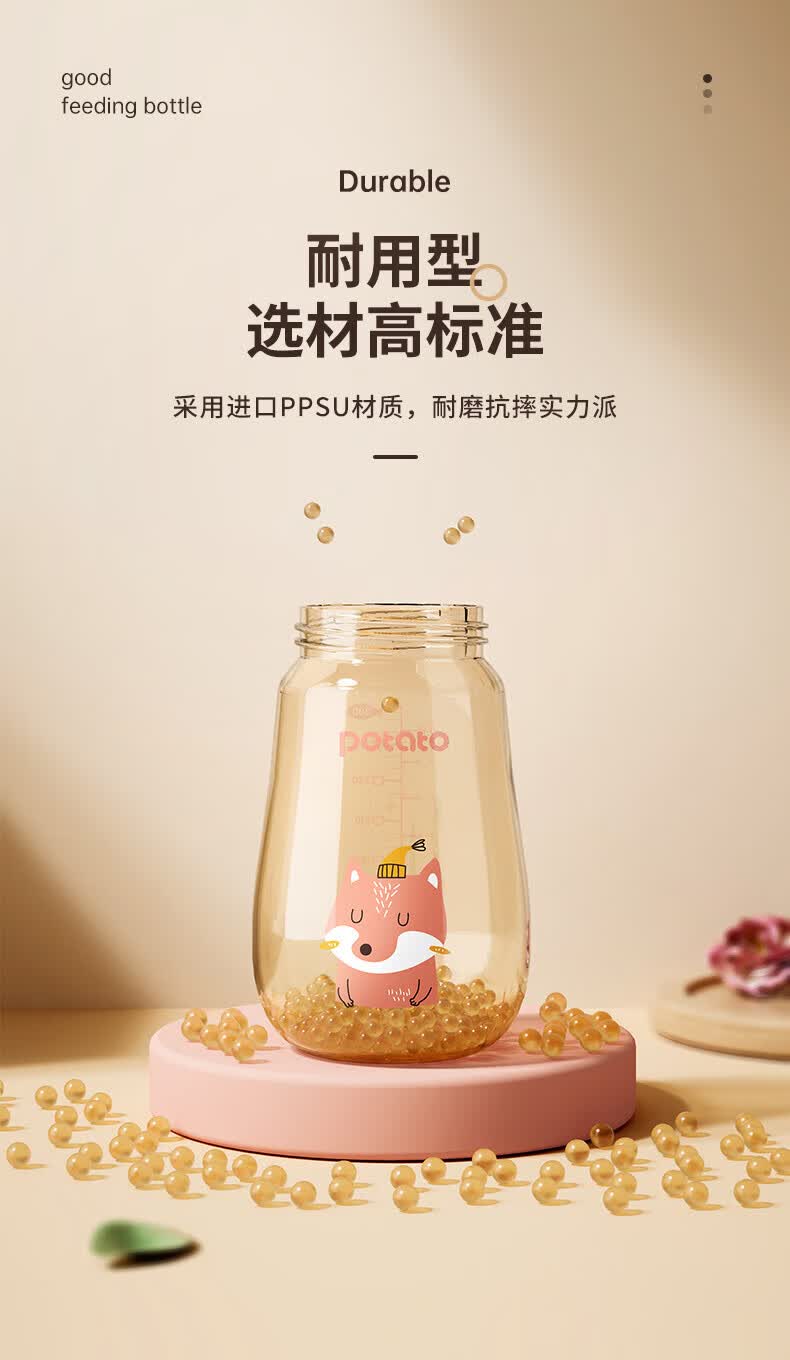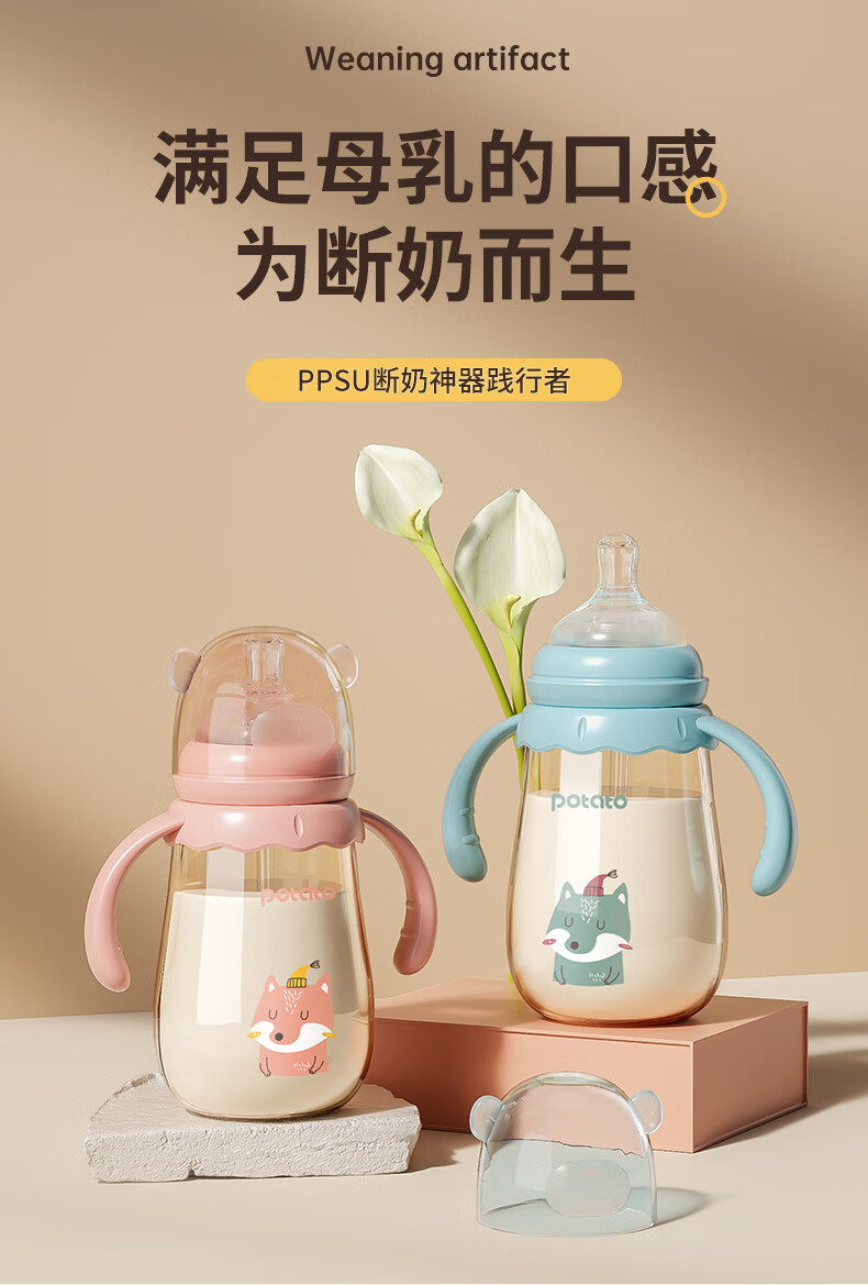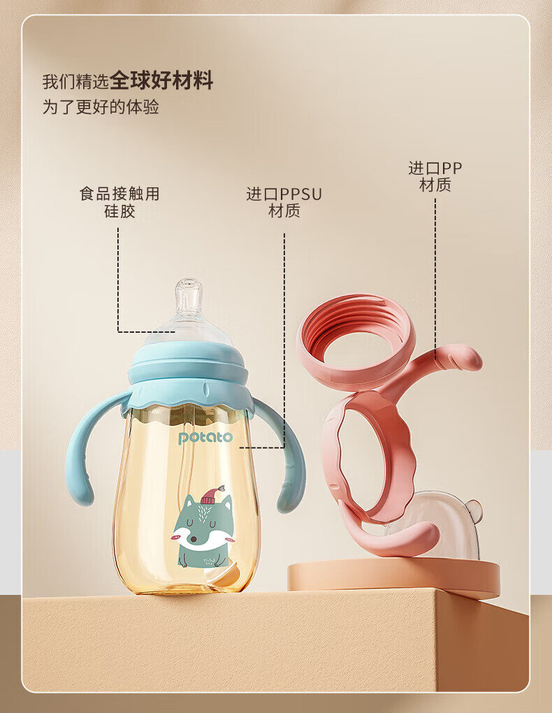 小土豆(potato)婴儿ppsu宽口径带手柄重力球吸管奶瓶配L号4个月以上300ml妃桃粉