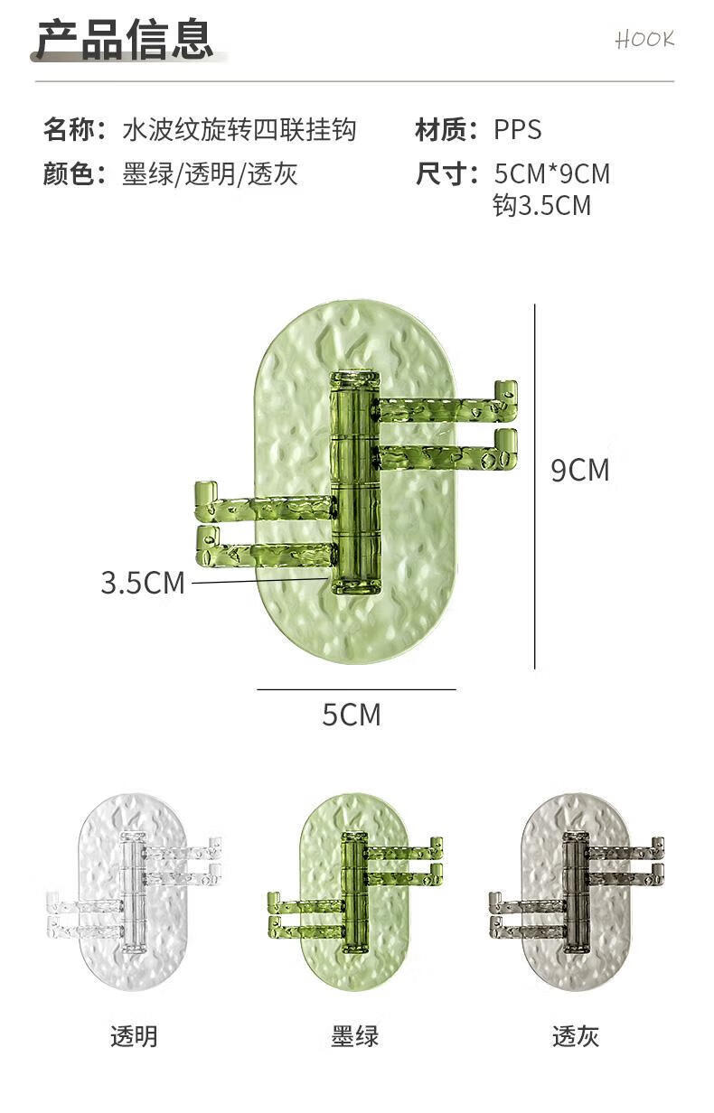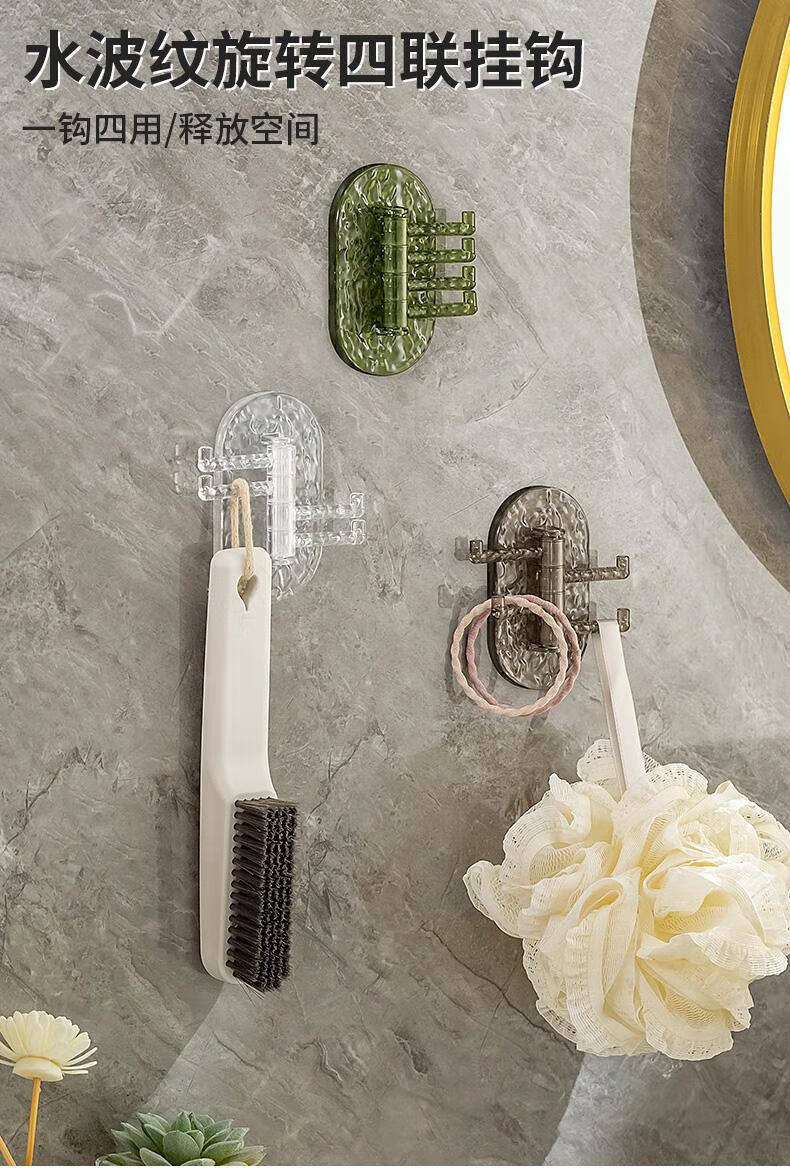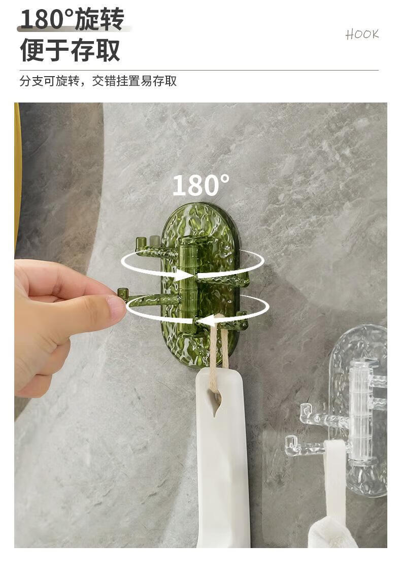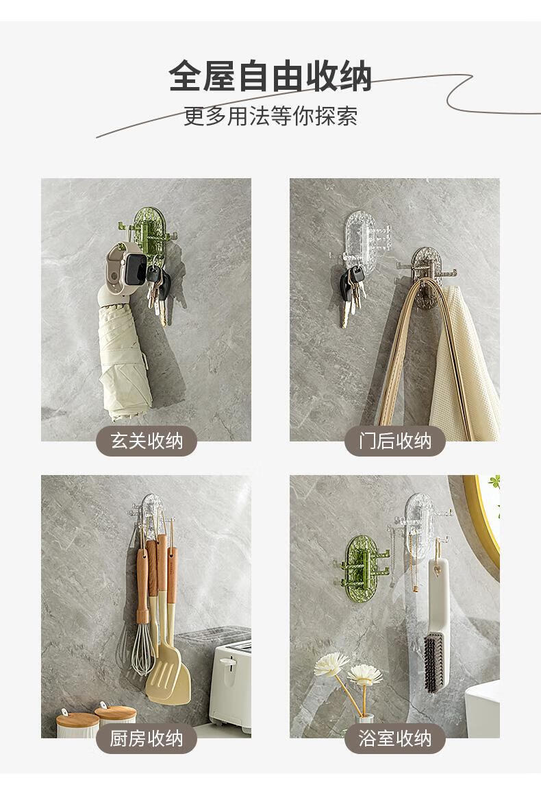 【工厂直发】创意多功能可旋转4联挂钩强力粘贴无痕免打孔钉厨房 透绿色-1个